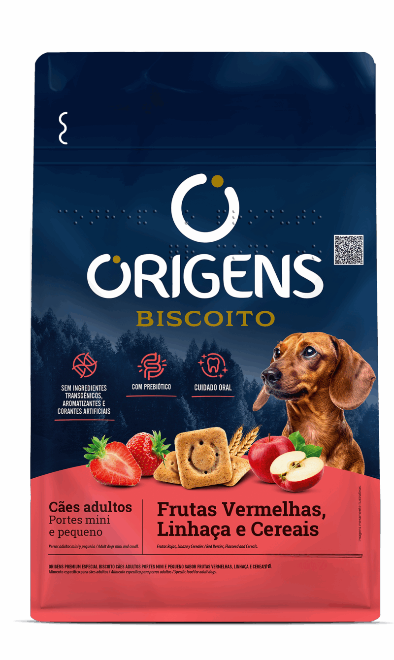 Origens Premium Especial Biscoito Cães Adultos Portes Mini E Pequeno Sabor Frutas Vermelhas, Linhaça e Cereais