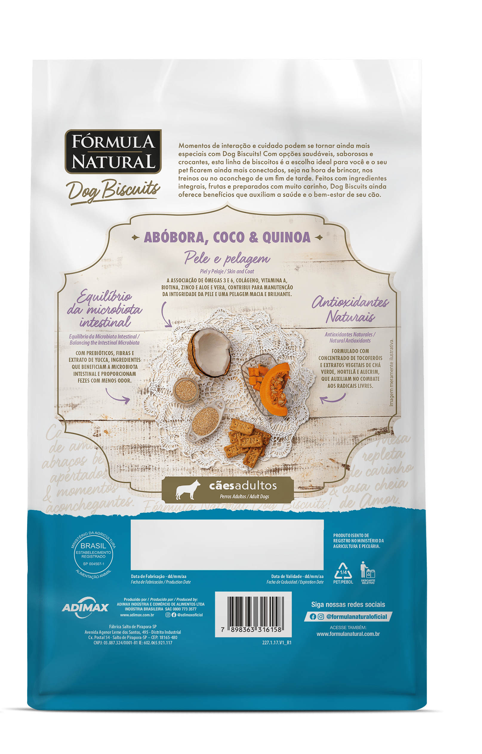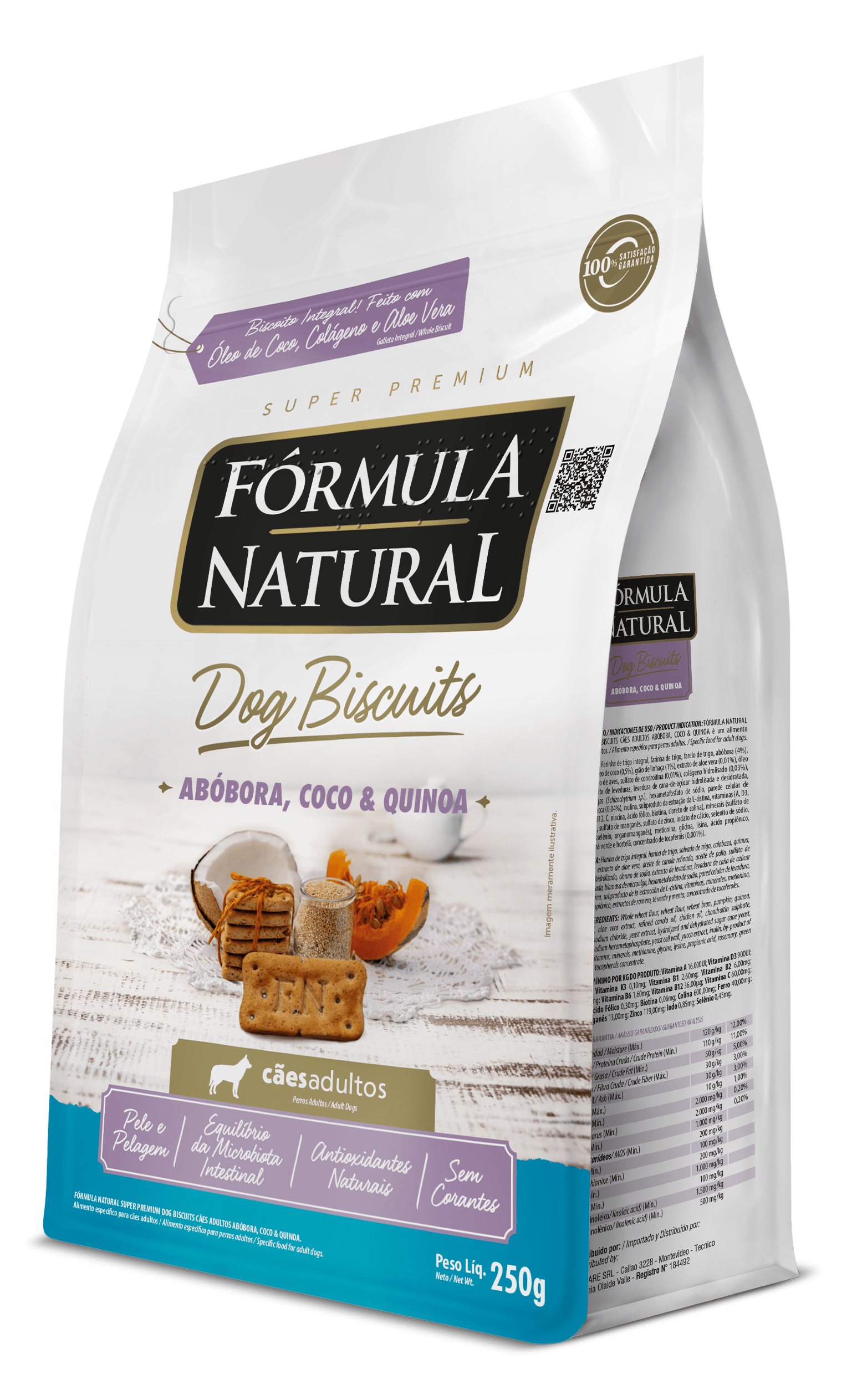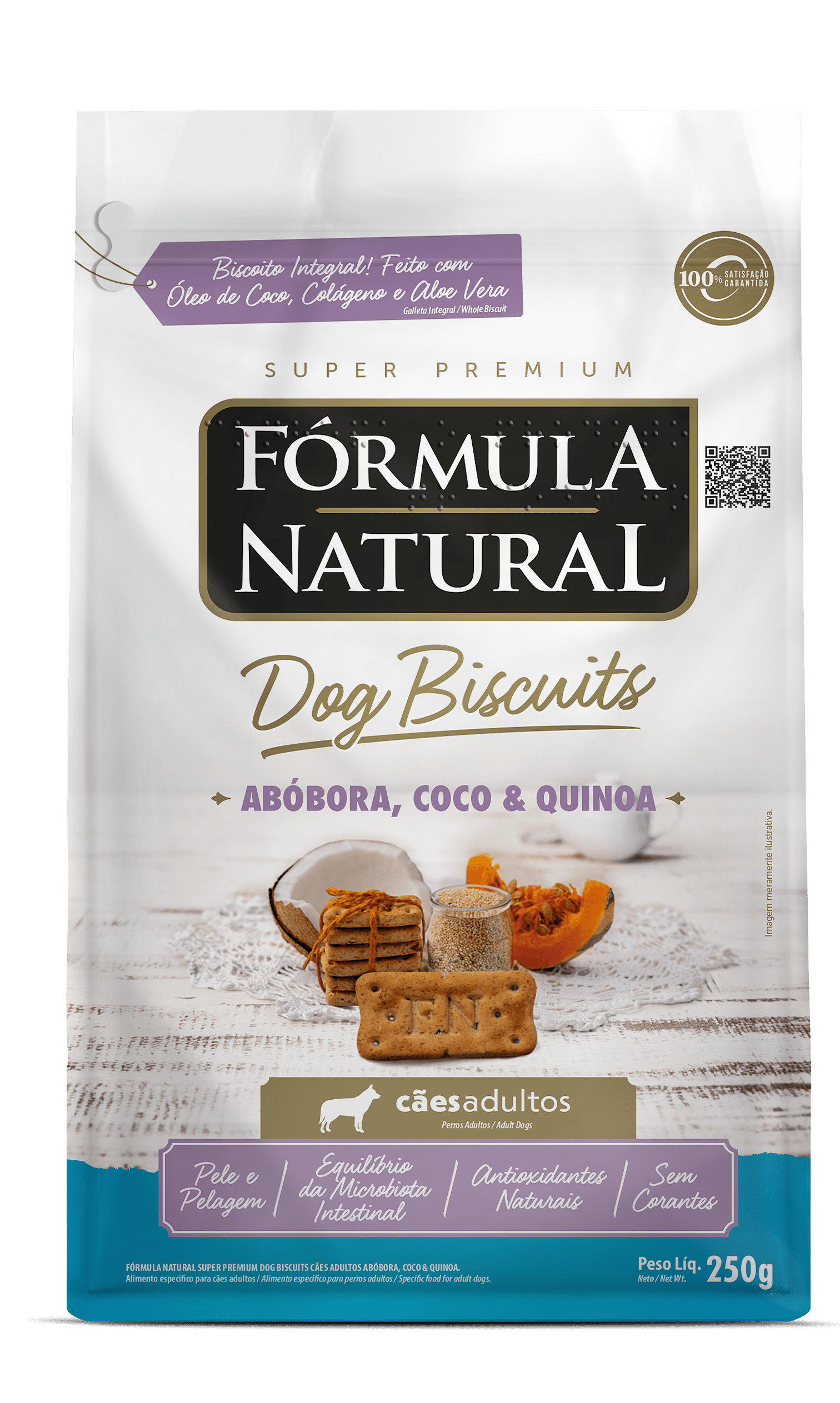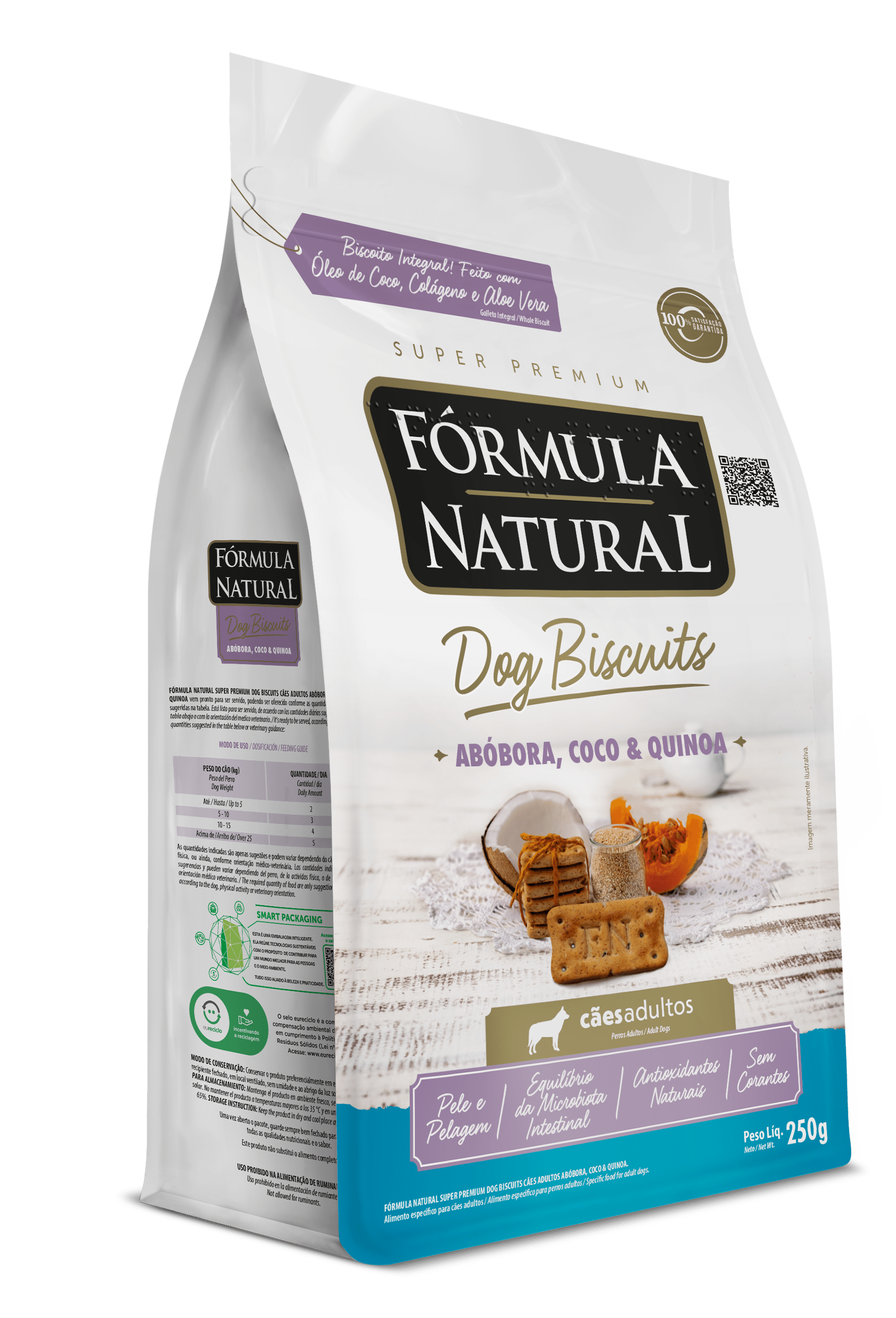 Fórmula Natural Dog Biscuits é uma linha de biscoitos de alta qualidade fornecido tanto para cães adultos de pequeno porte como para filhotes. Saborosos, saudáveis e nutritivos, são feitos com ingredientes naturais como abóbora, quinoa, coco e aloe vera. Esta linha também se destaca por ser rica em antioxidantes naturais, oferecer benefícios para pele e pelagem, articulações, saúde oral e ser livre de corantes e aromatizantes artificiais.