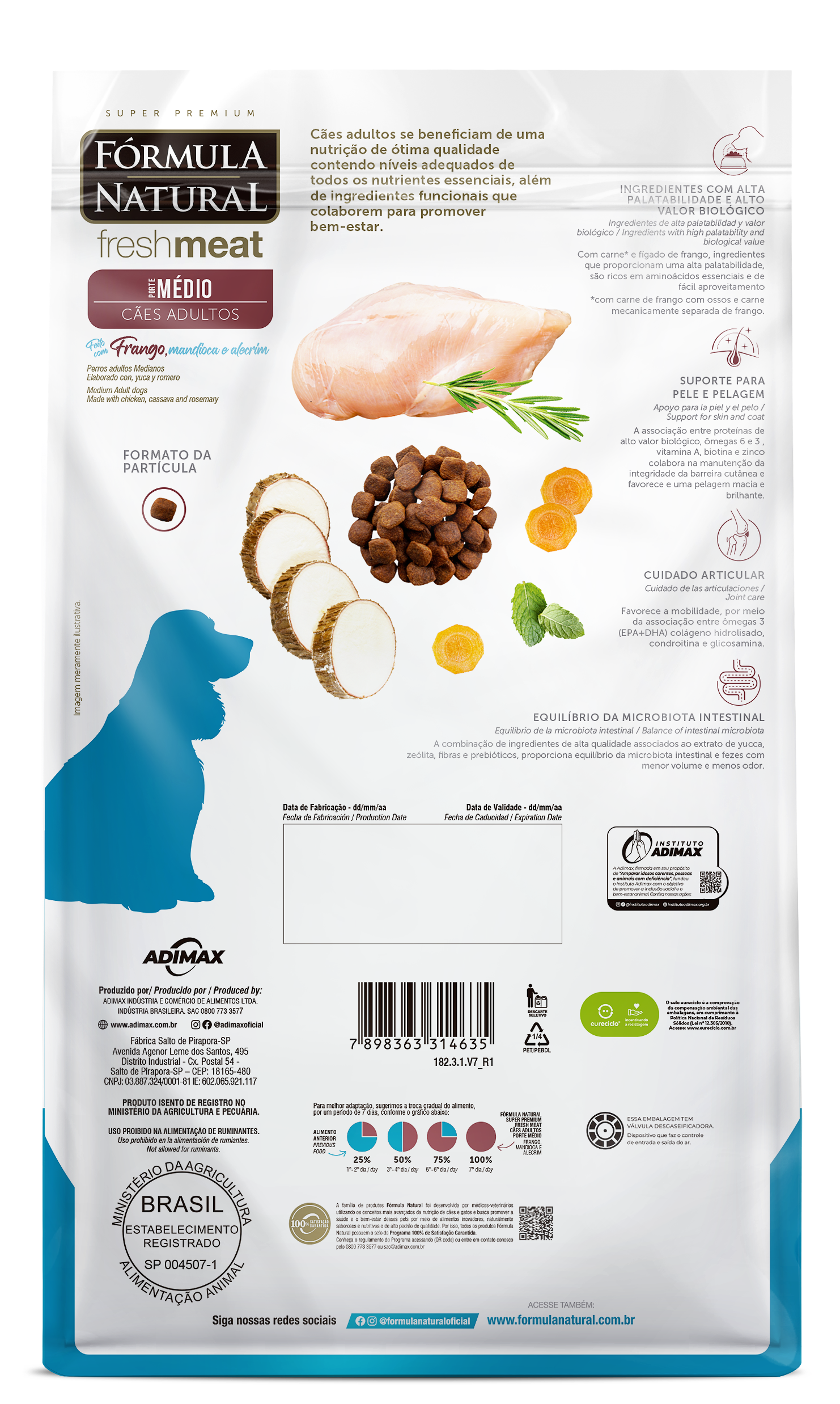 Carnes e miúdos selecionados (16% carne de frango com ossos, carne mecanicamente separada de frango e fígado de frango), farinha de vísceras de aves, farinha de mandioca (15%), fécula de mandioca, farinha de ervilha, fécula de batata, óleo de aves, óleo refinado de peixe, hidrolisado de fígado de aves e suíno, fibra de cana-de-açúcar, frutas e vegetais desidratados (manga, maçã e cenoura), polpa de beterraba, farinha de linhaça, cloreto de sódio, cloreto de potássio, biomassa de microalgas (Schizochytrium sp.), zeolita (0,01%), parede celular de levedura, frutooligossacarídeos, inulina, extrato de yucca (0,04%), colágeno hidrolisado (0,05%), sulfato de condroitina (0,01%), sulfato de glicosamina (0,03%), vitaminas (A, D3, E, K3, B1, B2, B5, B6, B12, C, niacina, ácido fólico, biotina, cloreto de colina), minerais (sulfato de ferro, sulfato de cobre, sulfato de manganês, sulfato de zinco, iodato de cálcio, selenito de sódio, organozinco, organosselênio, organomanganês), ácido propiônico, lisina, metionina, taurina, extratos de alecrim, chá verde e hortelã (0,01%), concentrado de tocoferóis (0,01%).