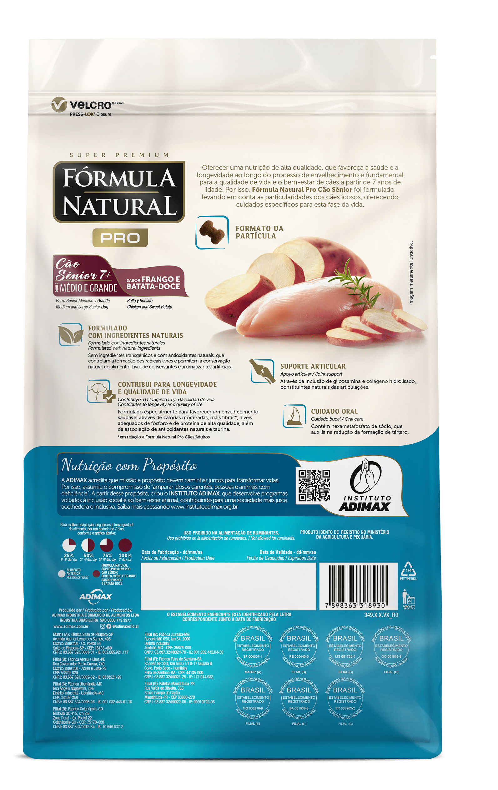 Oferecer uma nutrição de alta qualidade, que favoreça a saúde e a longevidade ao longo do processo de envelhecimento é fundamental para a qualidade de vida e o bem-estar de cães a partir de 7 anos de idade. Por isso, Fórmula Natural Pro Cão Sênior foi formulado levando em conta as particularidades dos cães idosos, oferecendo cuidados específicos para esta fase da vida.