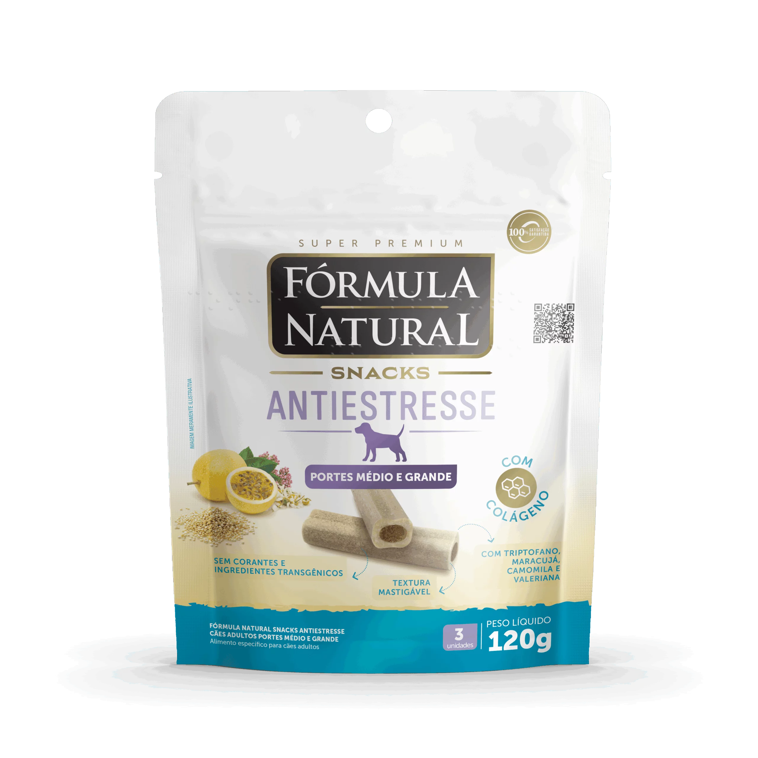 Fórmula Natural Snacks é uma linha de petiscos com ingredientes naturais e funcionais que reúne os cuidados que os médicos-veterinários indicam com o sabor e carinho que os pets adoram. Saborosos e com textura diferenciada, a linha conta com quatro versões: antiestresse, vitalidade, pele e pelagem e dental. Fórmula Natural Snacks Antiestresse é formulado com triptofano, maracujá, camomila e valeriana, além de possuir textura que estimula a mastigação. O fornecimento desse petisco, atrelado ao manejo adequado do ambiente, auxilia na diminuição dos sinais de estresse.