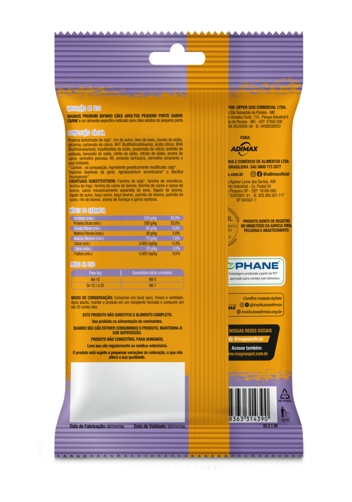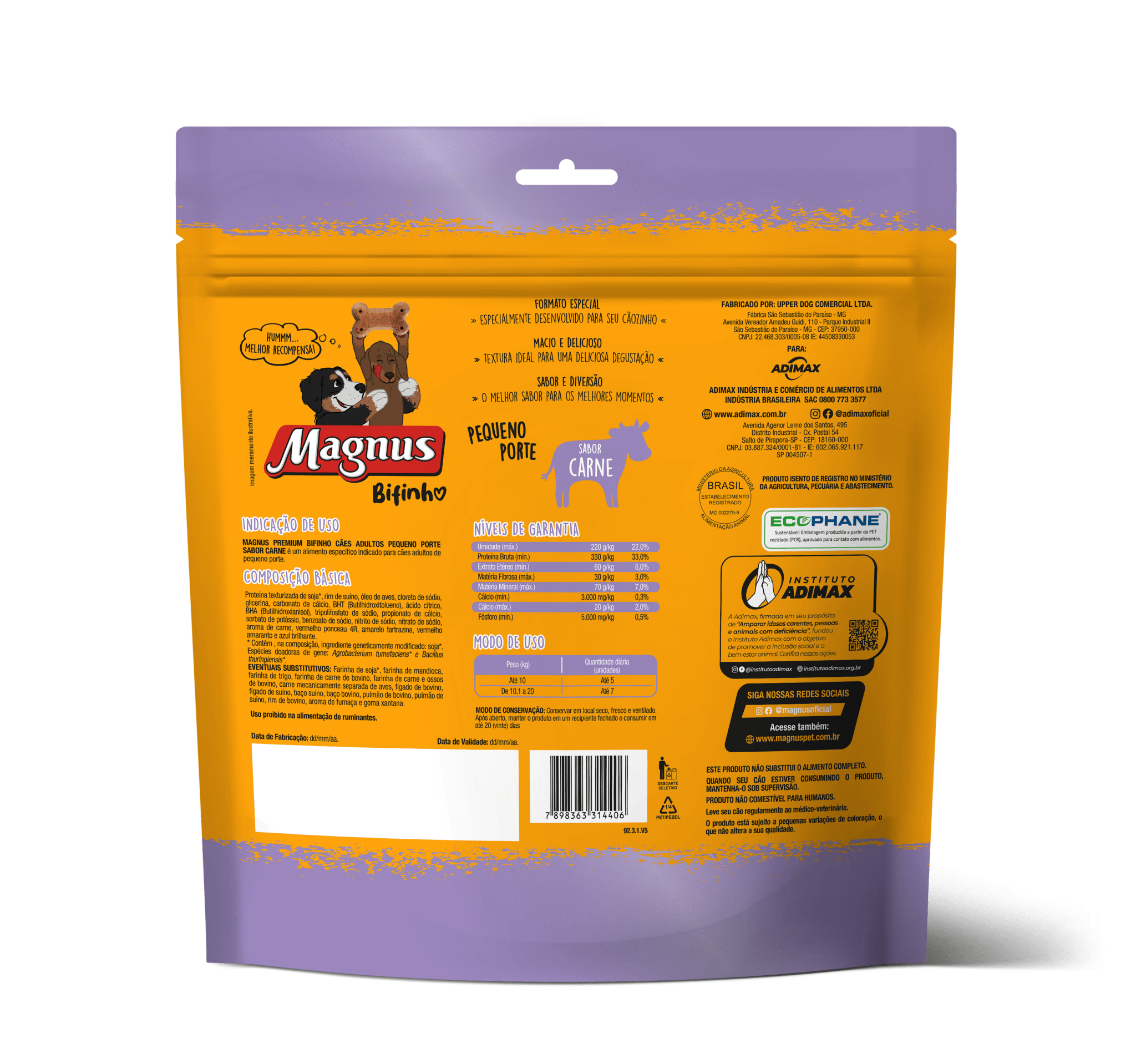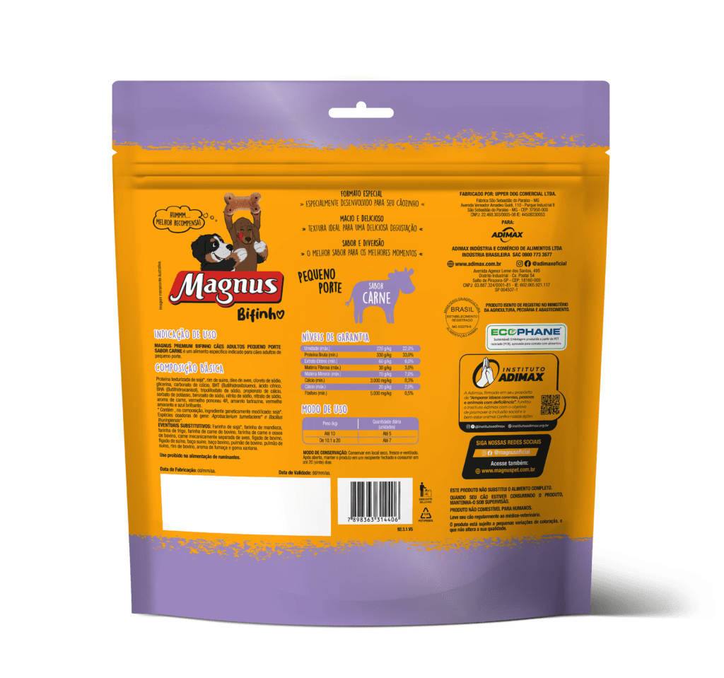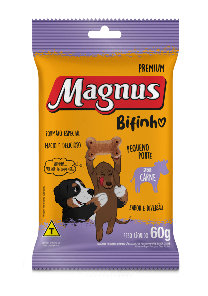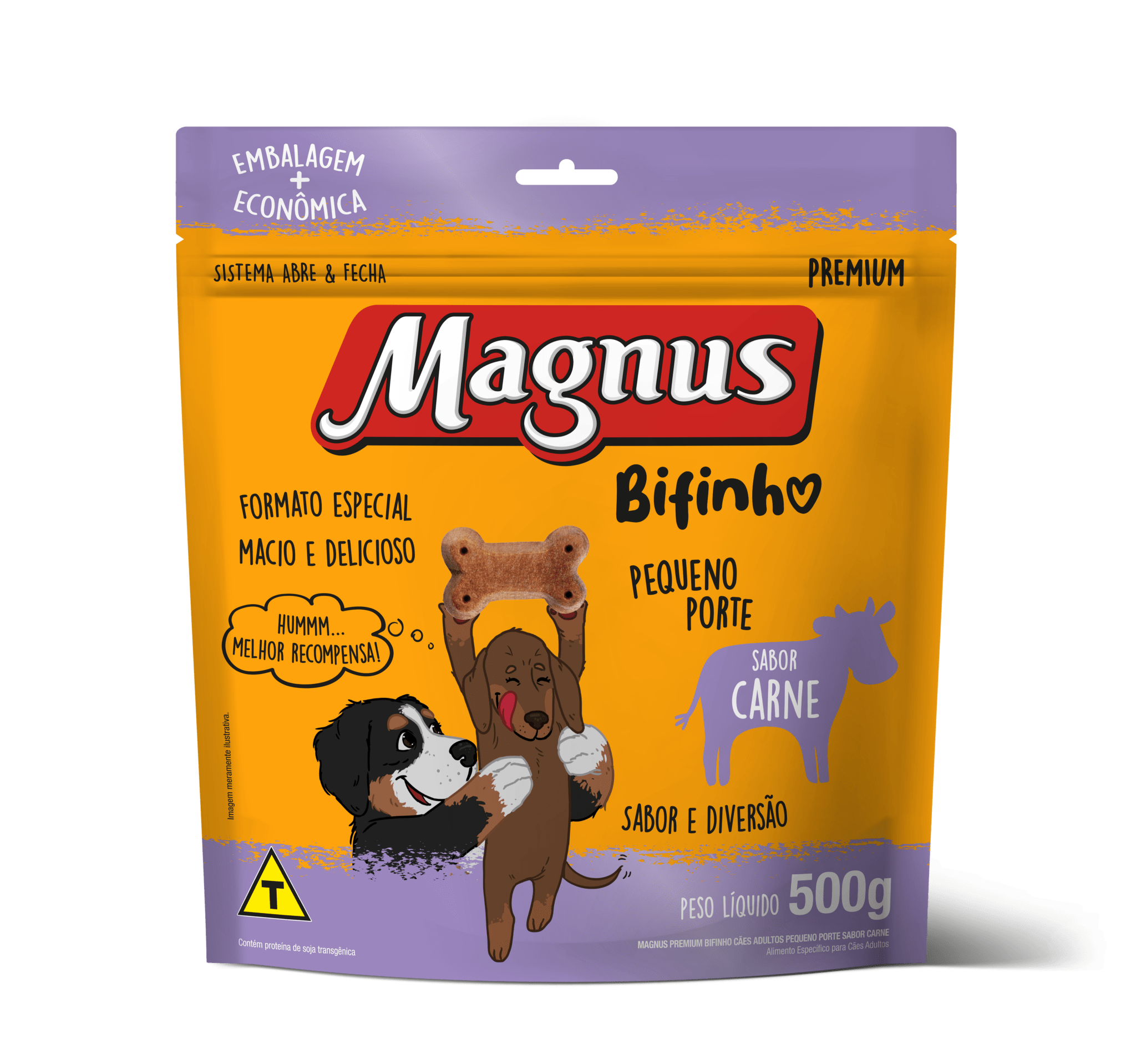 Magnus Bifinho Mastigável Pequeno Porte Sabor Carne é indicado para cães adultos de portes mini e pequeno. Aproveite os momentos de diversão e alegria com o seu melhor amigo. Ofereça para ele Magnus Bifinho.