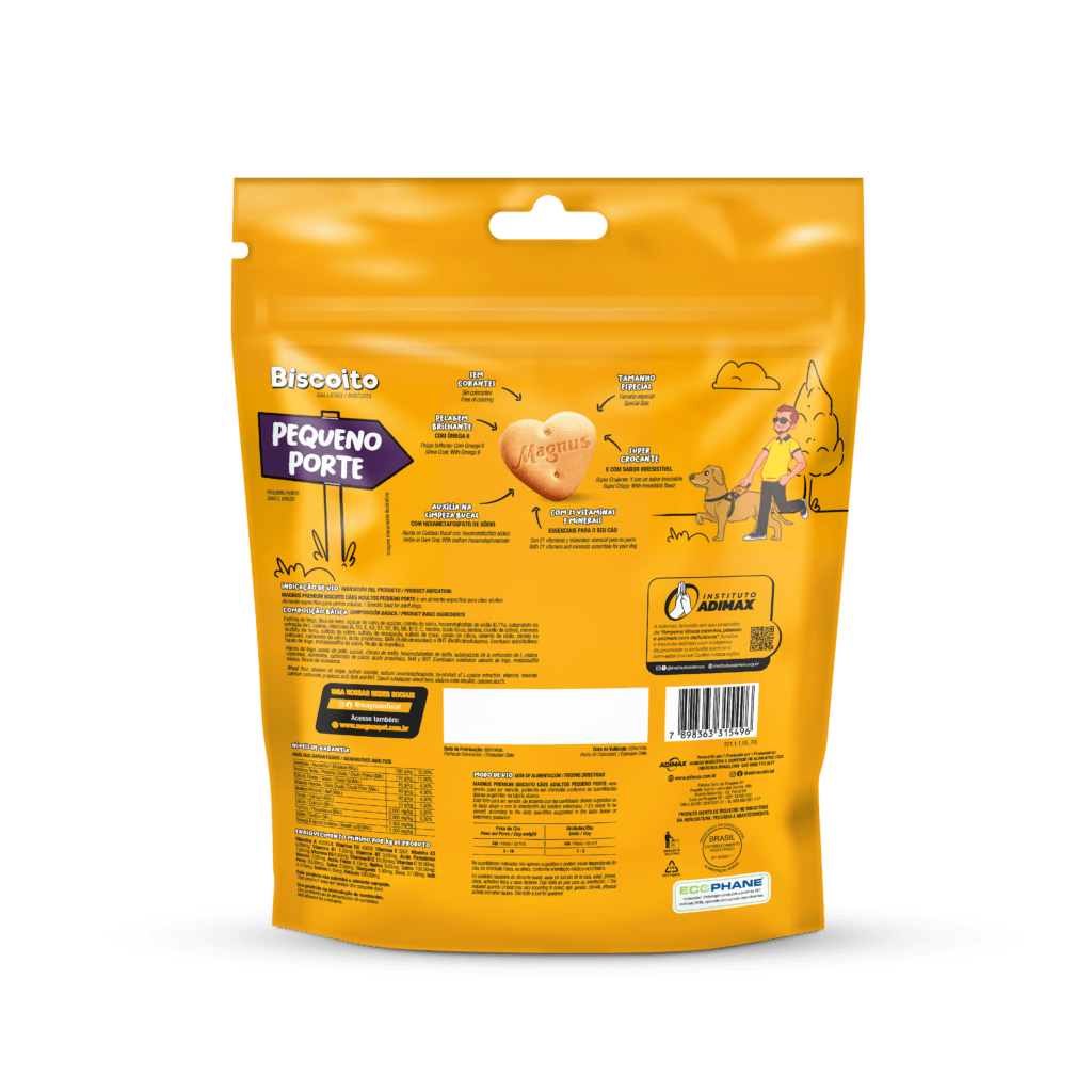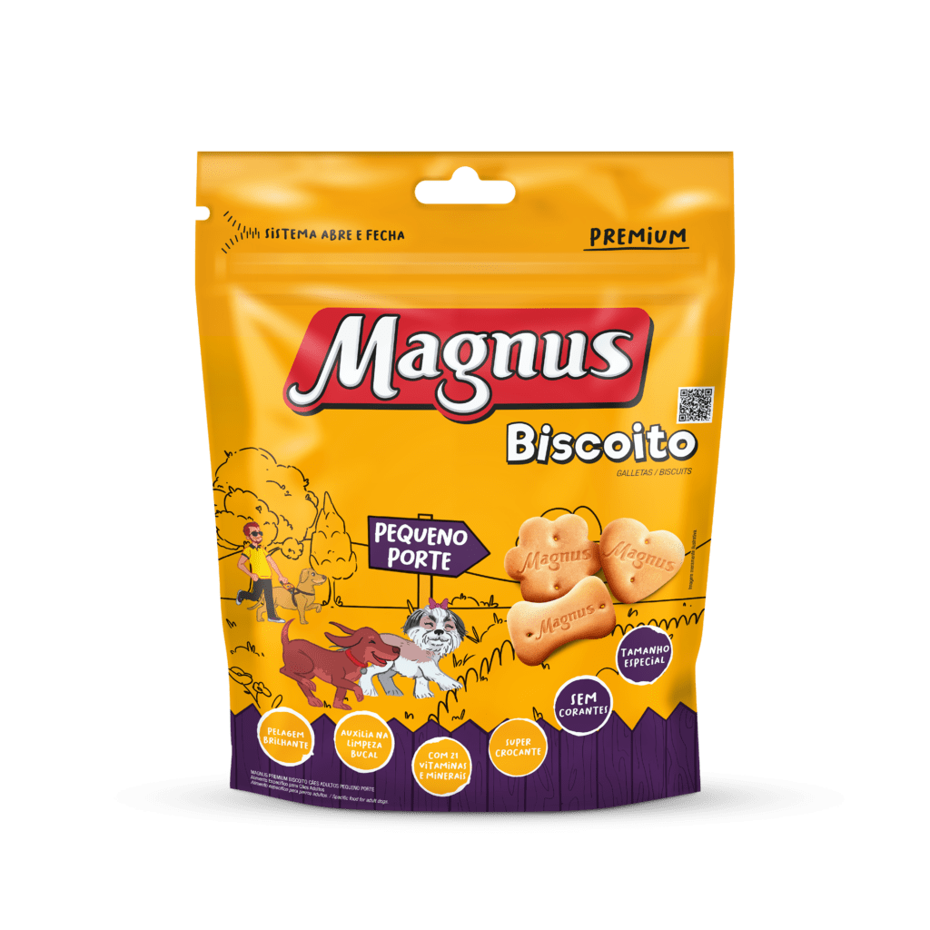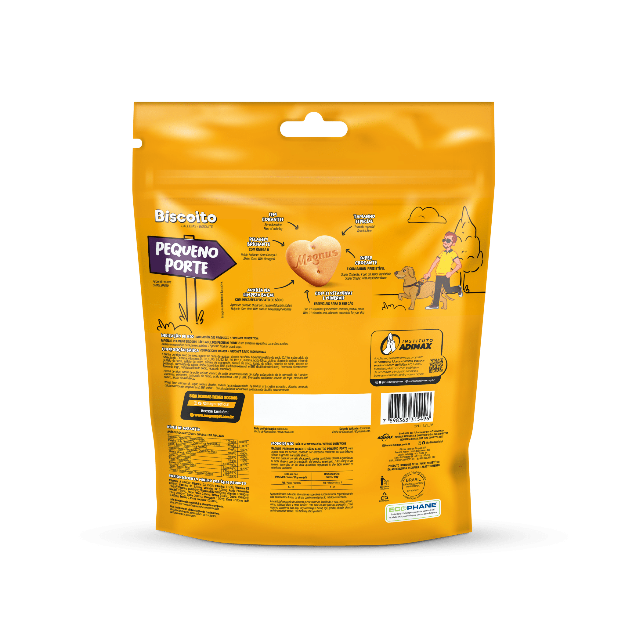 Magnus Biscoito Cães Adultos Pequeno Porte é um biscoito especifico para cães de pequeno porte, elaborado com ingredientes especialmente selecionados que proporciona um sabor inigualável, além de auxiliar na limpeza bucal. Pode ser oferecido ao seu cão como demonstração de carinho, em momentos de diversão ou como recompensa em treinamentos.