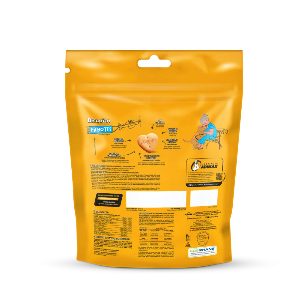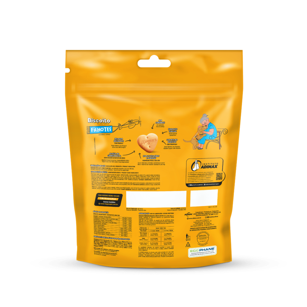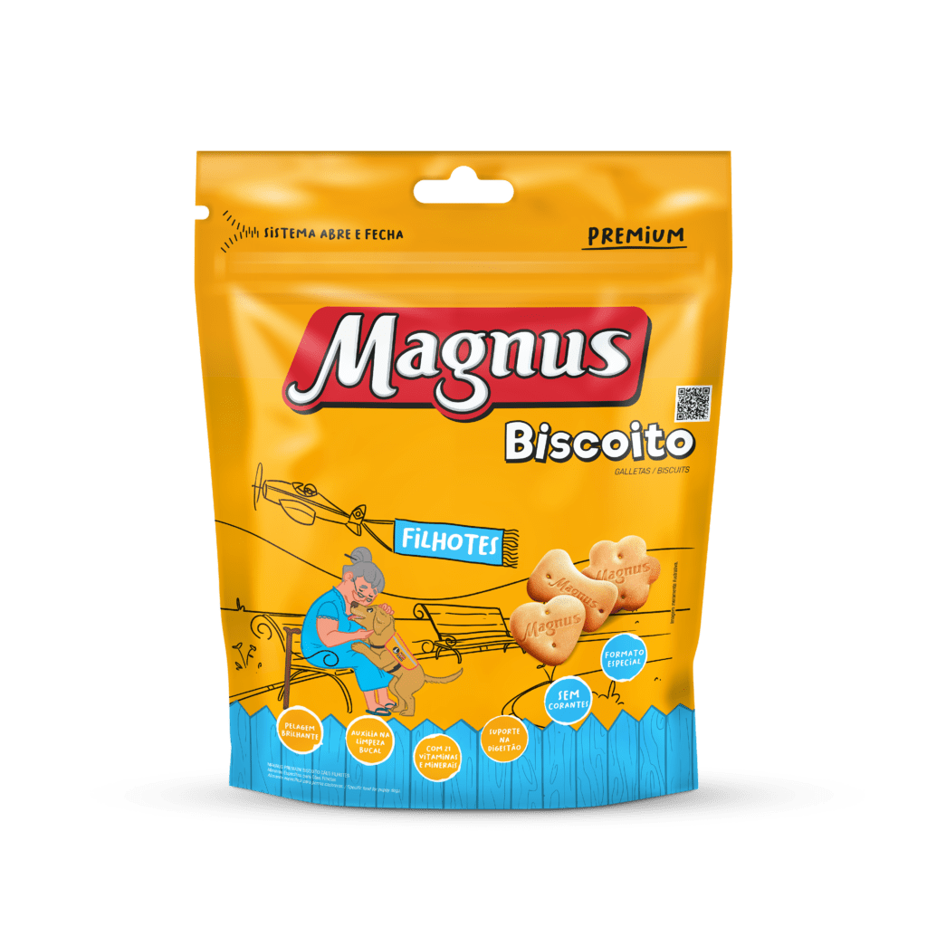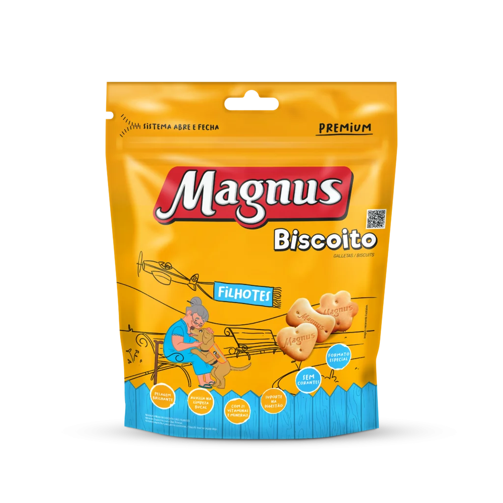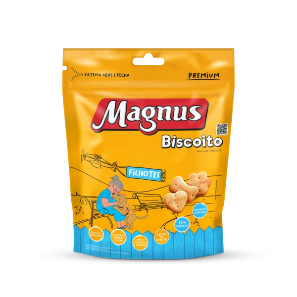 Magnus Biscoitos Cães Filhotes é um biscoito especifico para cães de todos os portes, elaborado com ingredientes especialmente selecionados que proporciona um sabor inigualável, além de auxiliar na limpeza bucal, Pode ser oferecido ao seu cão como demonstração de carinho, em momentos de diversão ou como recompensa em treinamentos.