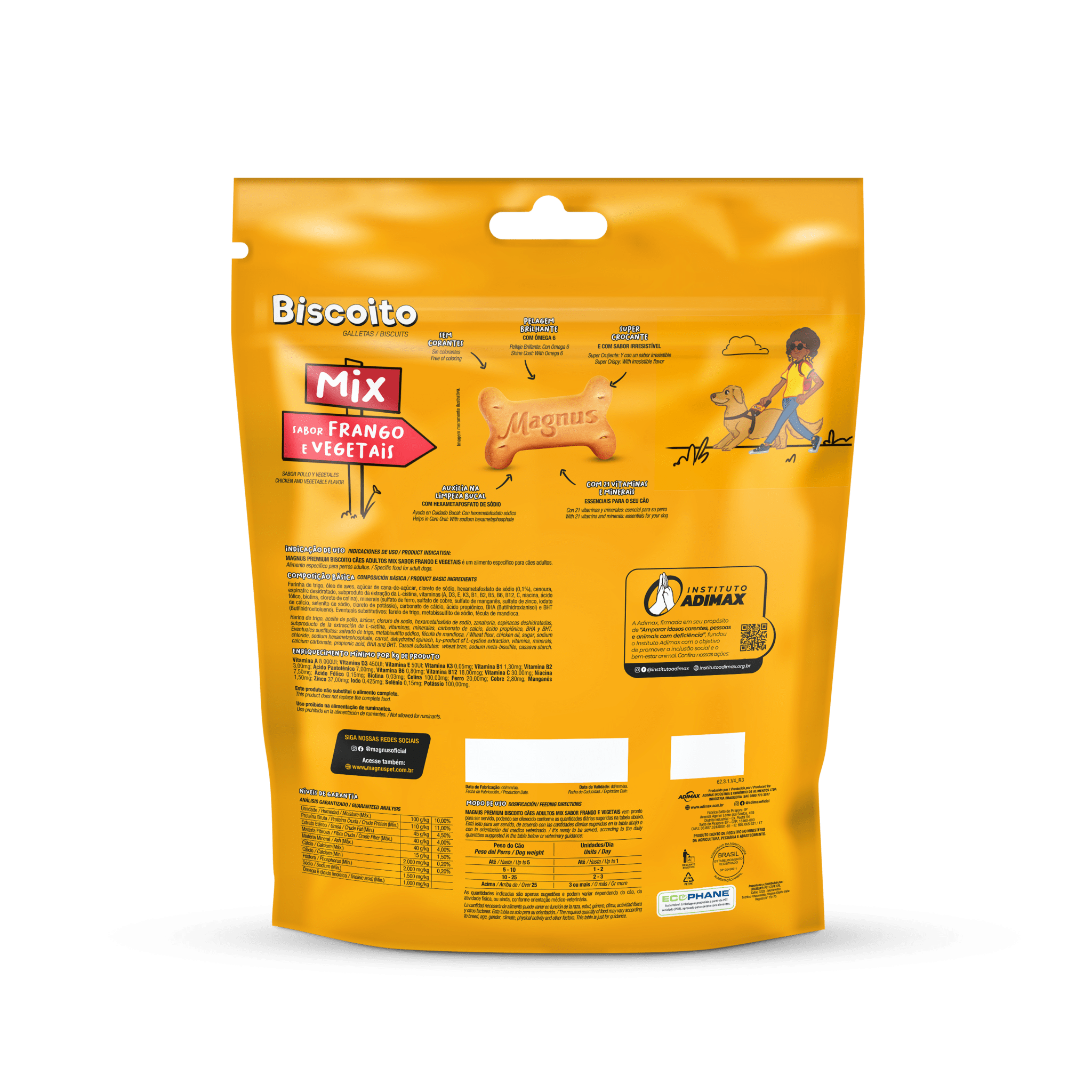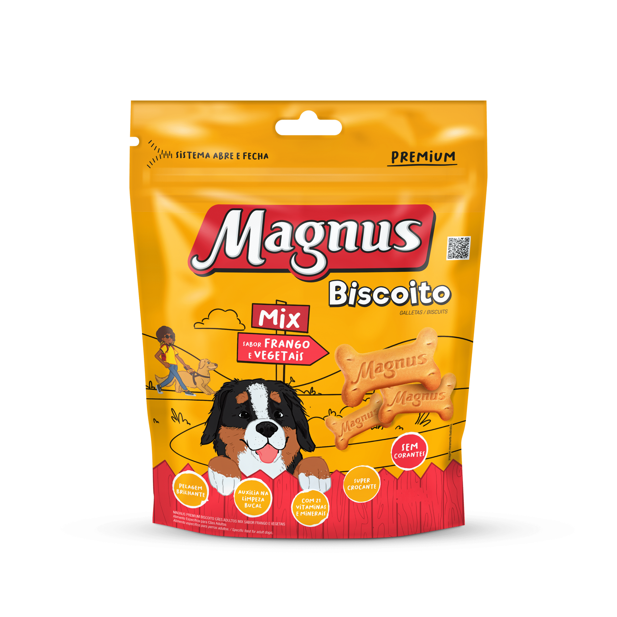 Magnus Biscoito Mix Cães Adultos é um biscoito especifico para cães de todos os portes, elaborado com ingredientes especialmente selecionados que proporciona um sabor inigualável, além de auxiliar na limpeza bucal, Pode ser oferecido ao seu cão como demonstração de carinho, em momentos de diversão ou como recompensa em treinamentos.