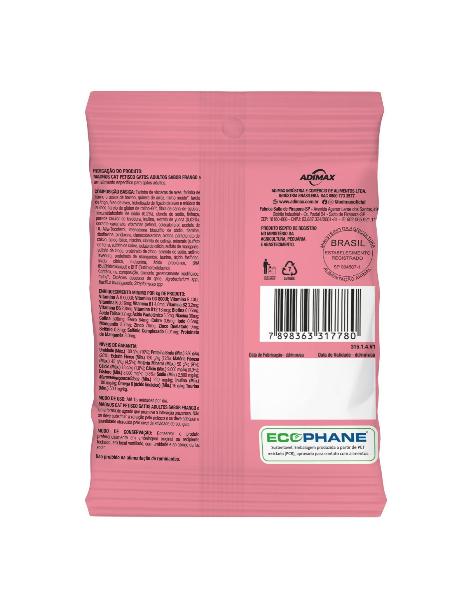 MAGNUS CAT PETISCO GATOS ADULTOS SABOR FRANGO é uma forma de agrado que promove a interação prazerosa. Não se deve substituir a refeição pelo petisco e se deve adequar a quantidade oferecida pelo nível de atividade de seu gato.