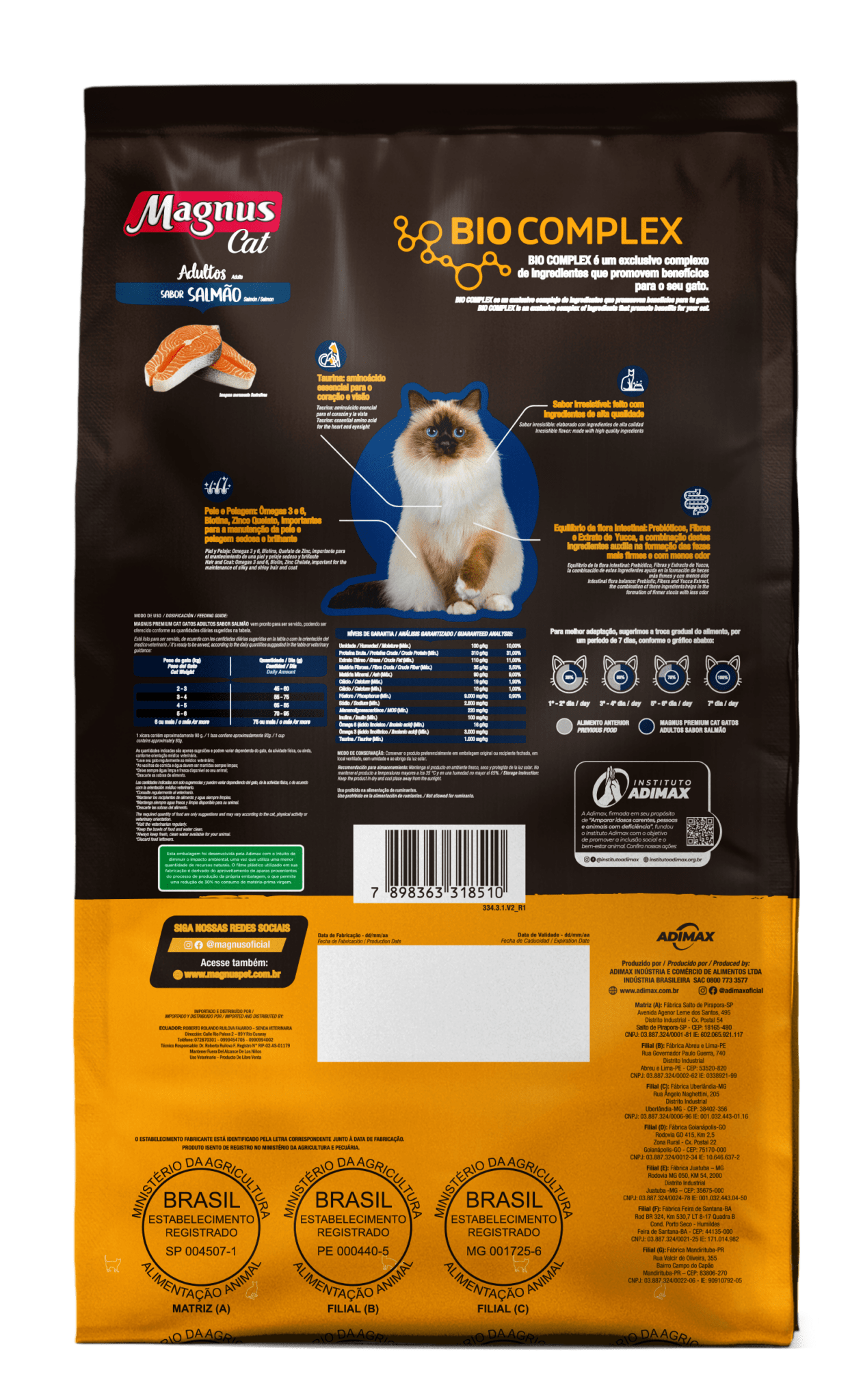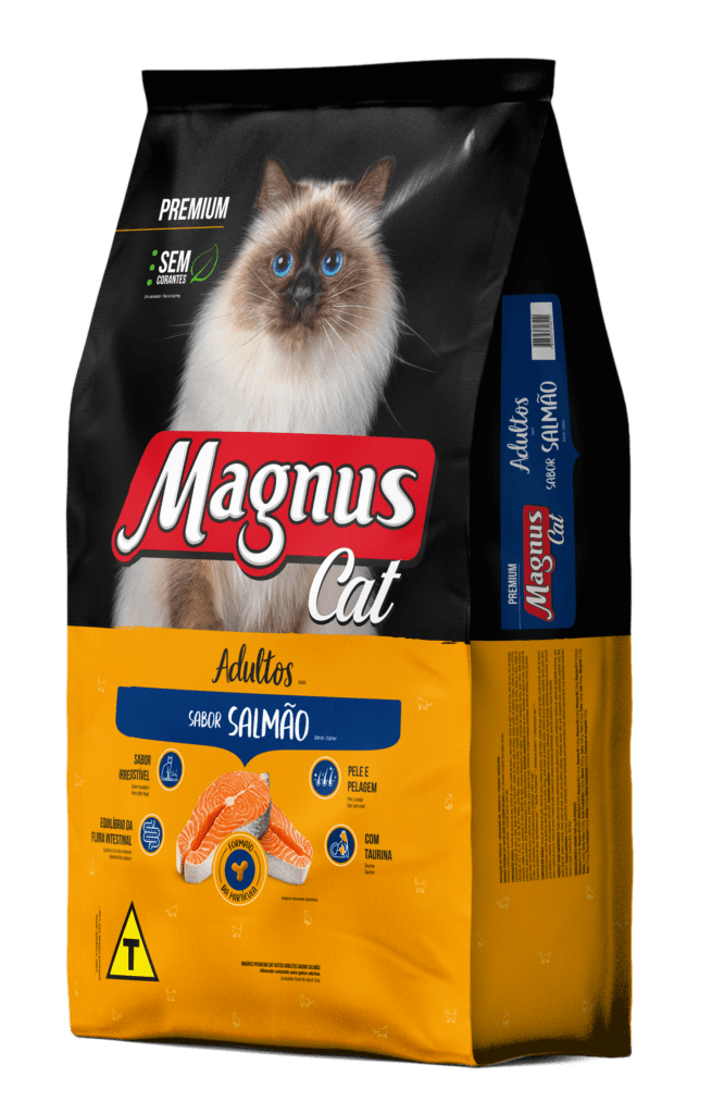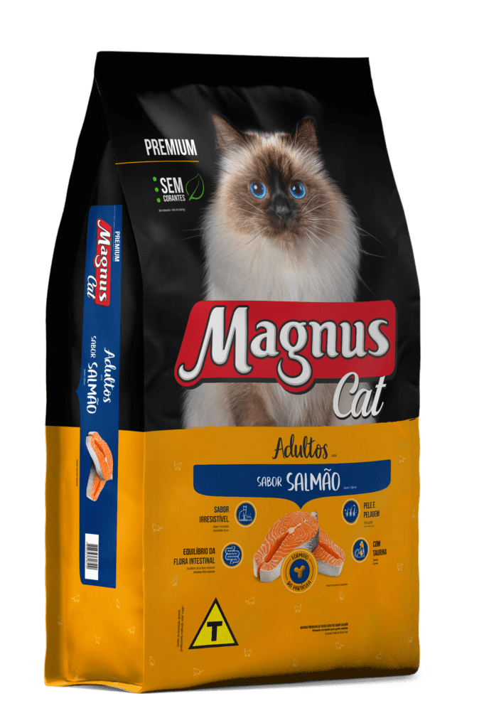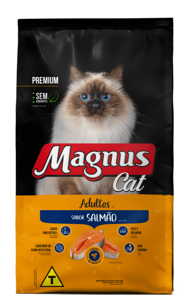 Magnus Cat Premium Gatos Adultos Sabor Salmão é um alimento seco completo, formulado com precisão para atender as exigências do gato adulto, de qualquer raça. Nutritivo e saboroso, agrada ao paladar diferenciado do gato, provendo benefícios a sua vida. BIO COMPLEX é um exclusivo complexo de ingredientes que promovem benefícios para o seu gato. Sabor irresistível: feito com ingredientes de alta qualidade. Equilíbrio da flora intestinal: Prebióticos, Fibras e Extrato de Yucca, a combinação destes ingredientes auxilia na formação das fezes mais. Pele e Pelagem: Ômegas 3 e 6, Biotina, Zinco Quelato, importantes para a manutenção da pele e pelagem sedosa e brilhante. Taurina: aminoácido essencial para o coração e visão.