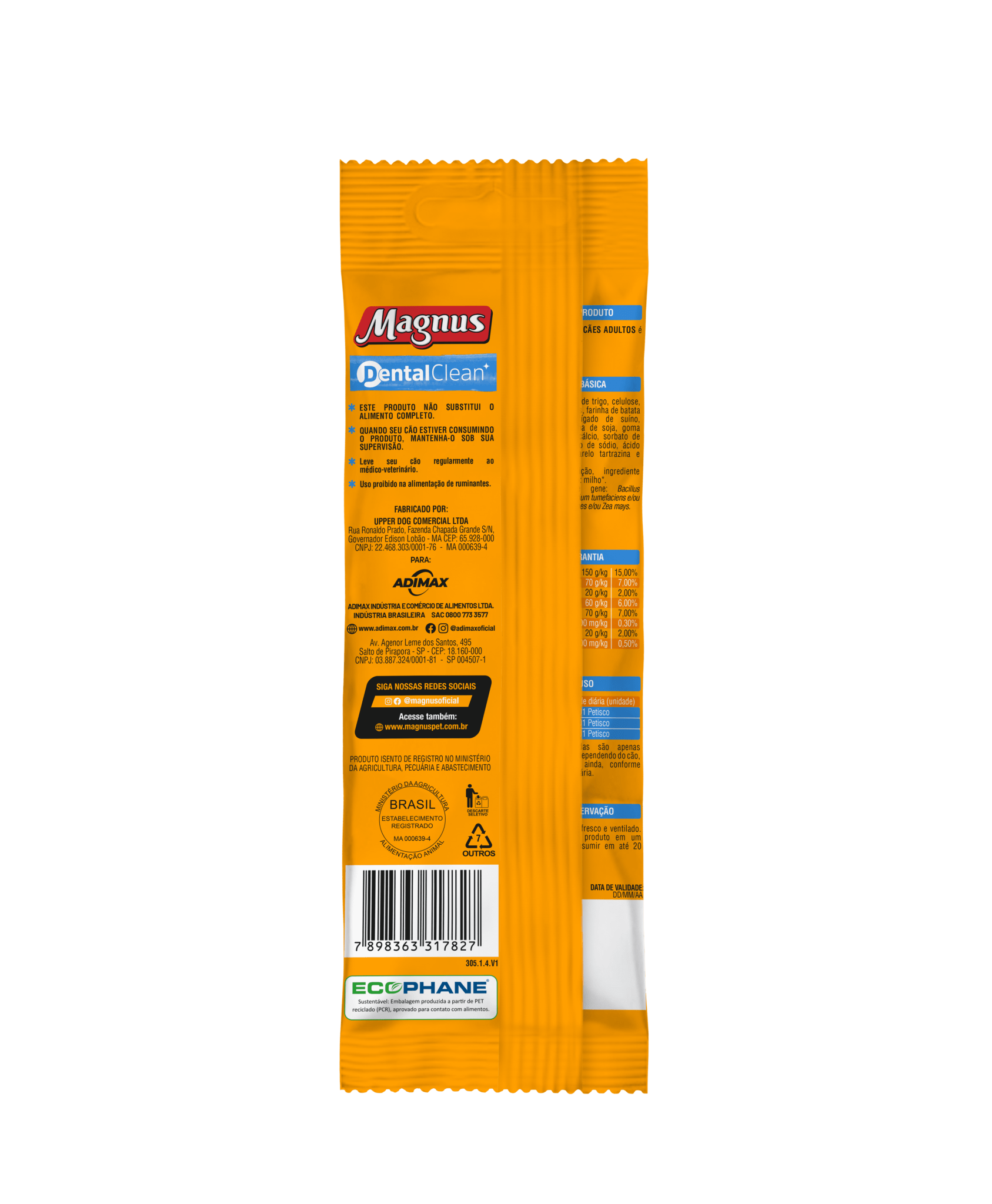 Amido de Milho*, farinha de trigo, celulose, farinha de vísceras de aves, farinha de batata doce, hidrolisado de fígado de suíno, glicerina, gelatina, lecitina de soja**, goma xantana, propionato de cálcio, sorbato de potássio, hexametafosfato de sódio, corantes (amarelo tartrazina e amarelo crepúsculo). Contém, na composição, alimento geneticamente modificado: milho* e soja**.