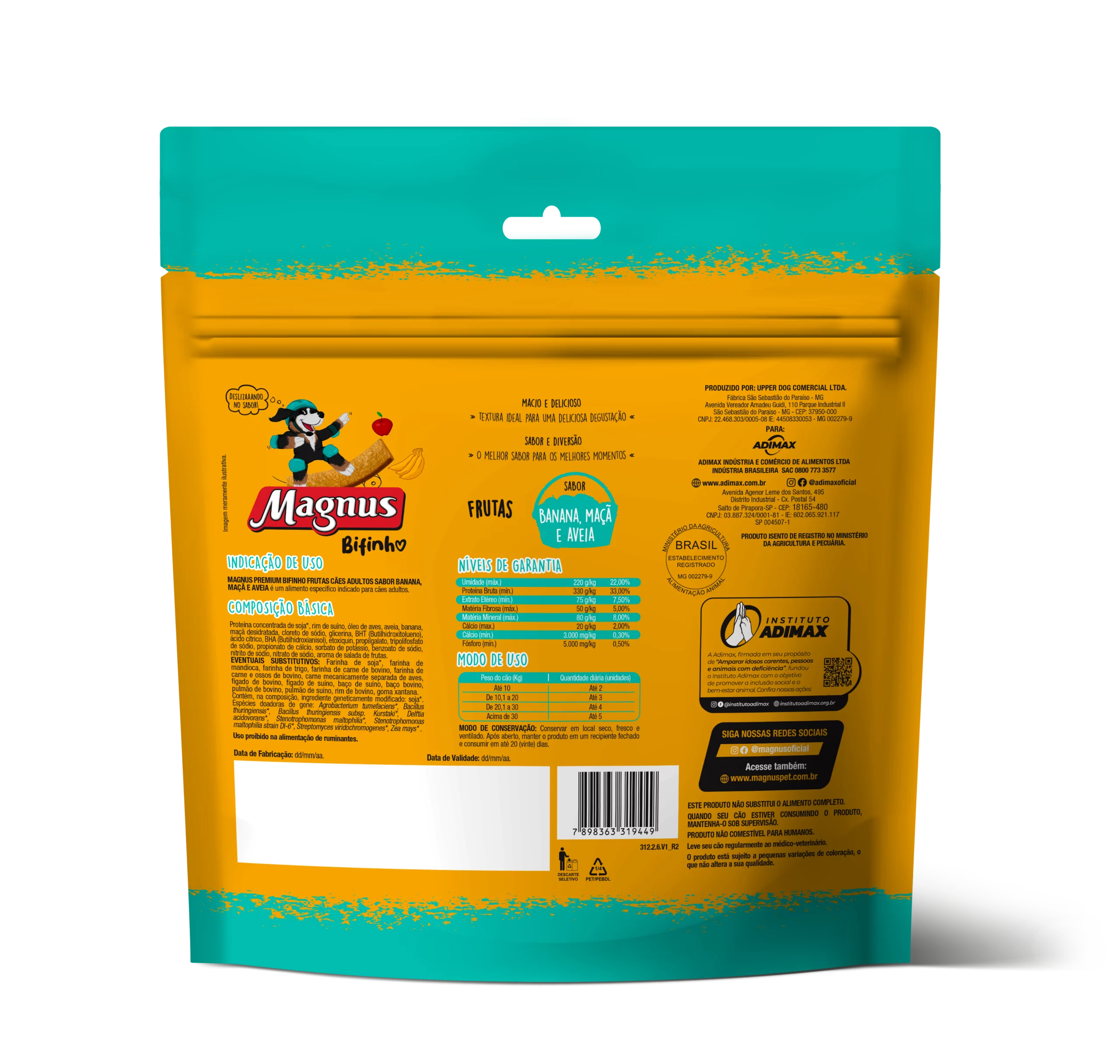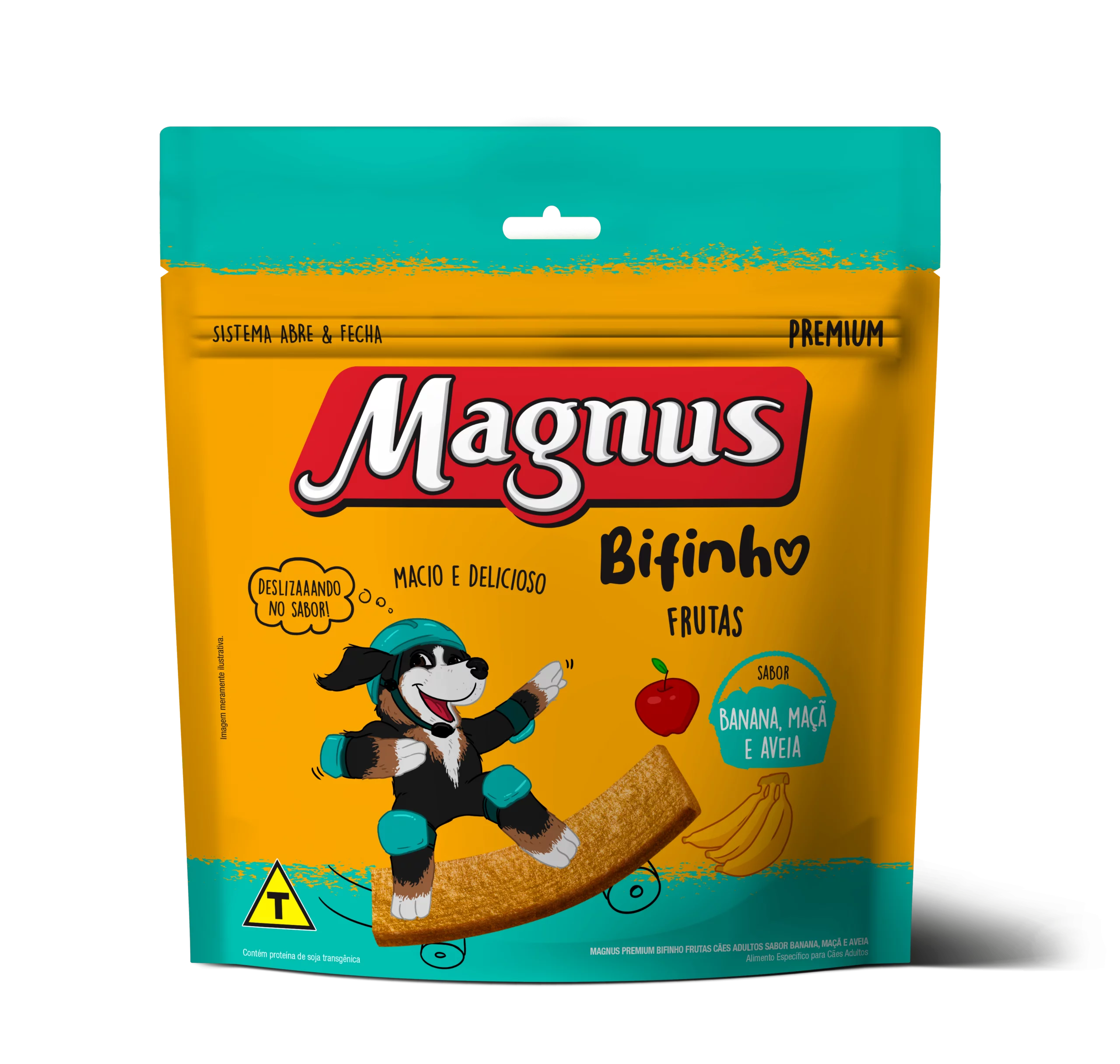Magnus Bifinho Fruta é indicado para cães adultos. Aproveite os momentos de diversão e alegria com o seu melhor amigo. Ofereça para ele Magnus Bifinho!