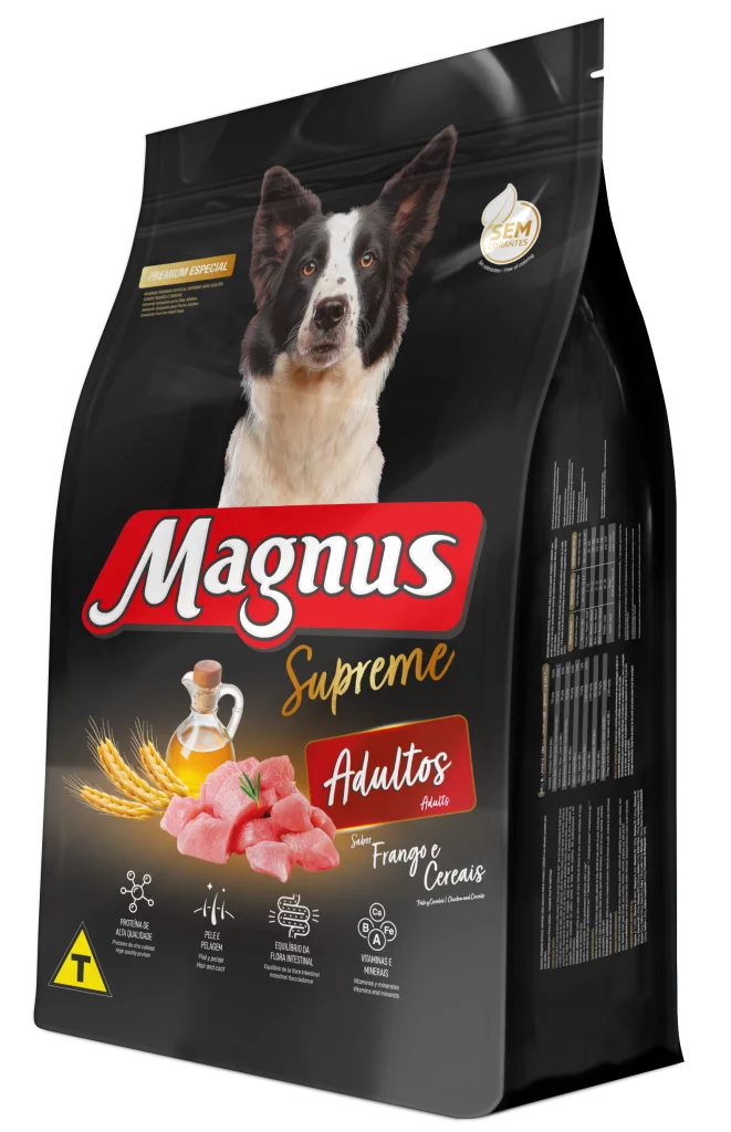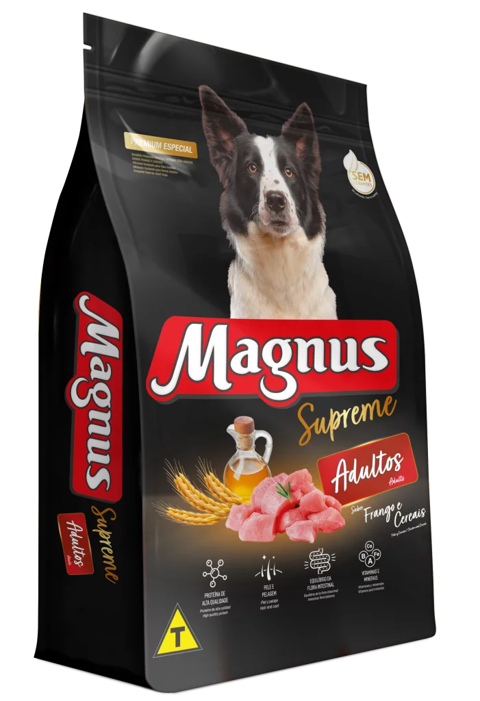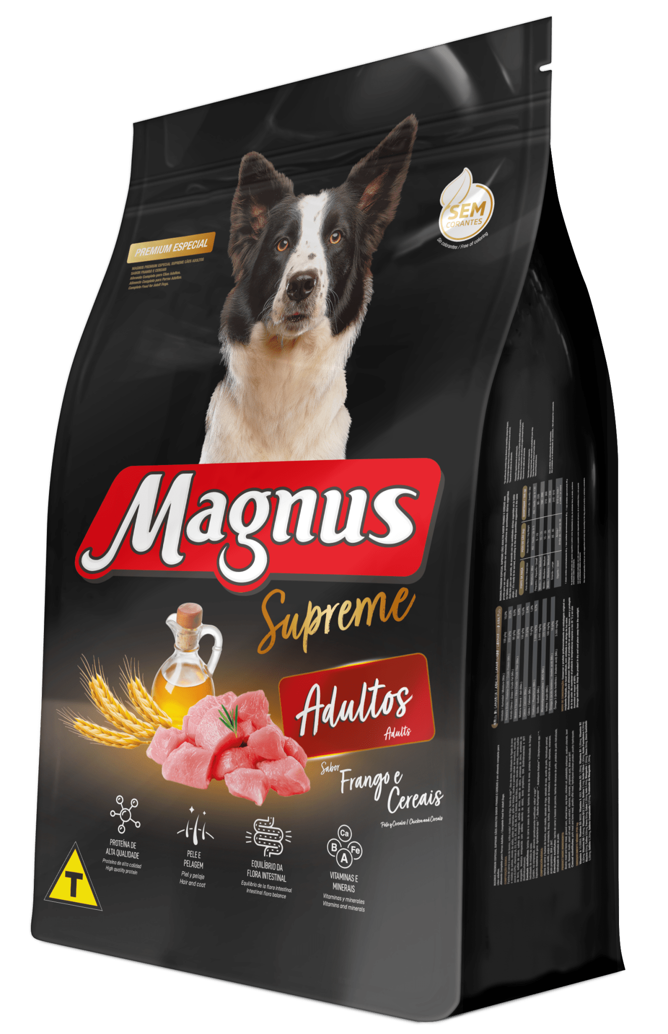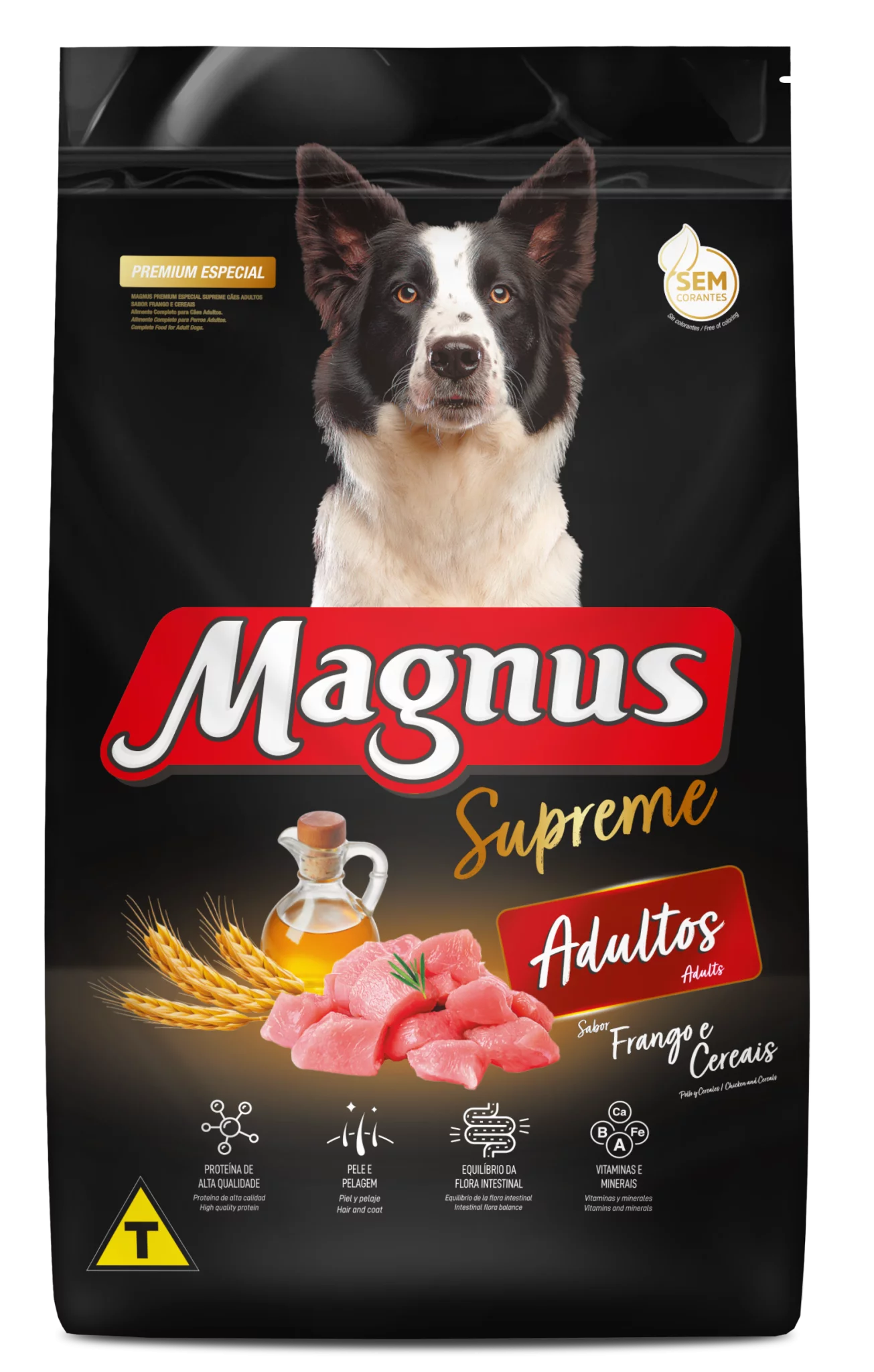 MAGNUS PREMIUM ESPECIAL SUPREME CAES ADULTOS SABOR FRANGO E CEREAIS é um alimento completo para cães adultos.