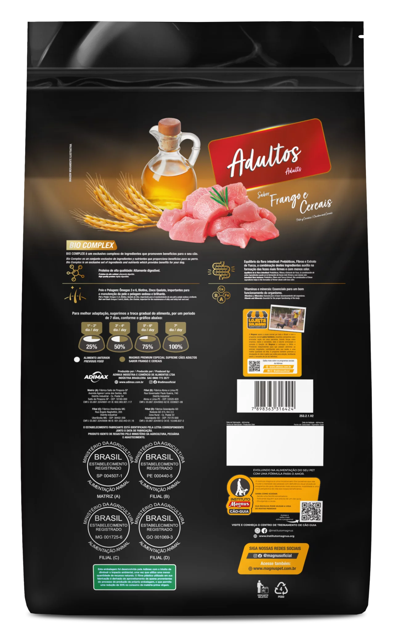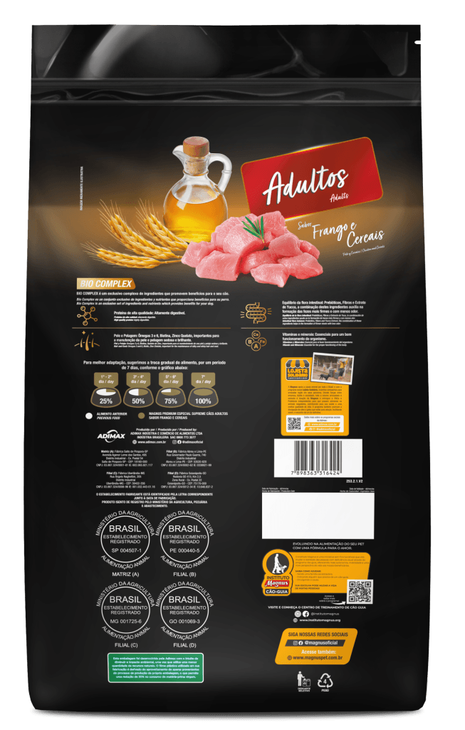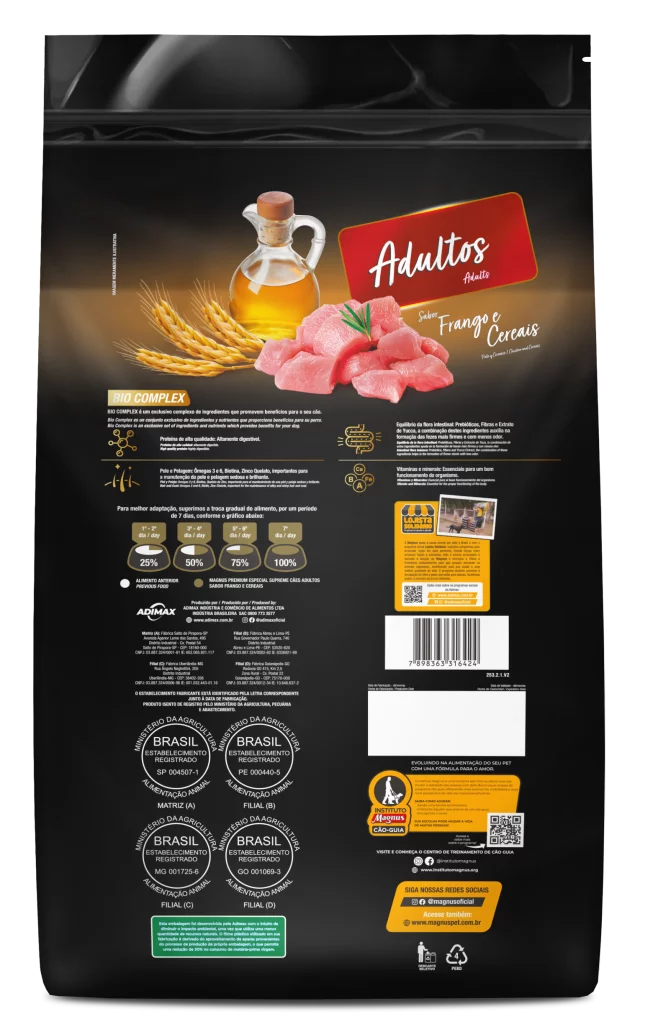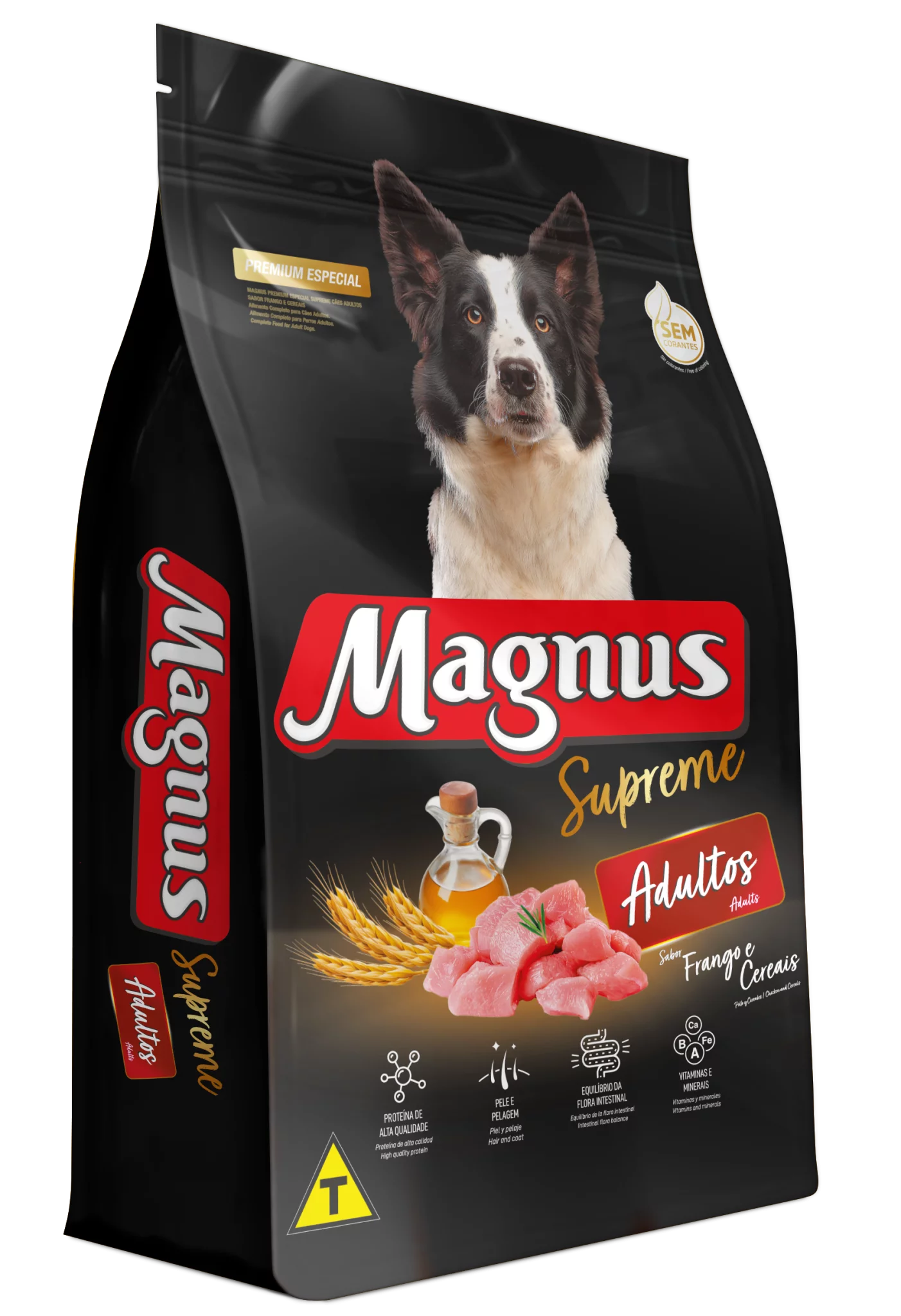 MAGNUS PREMIUM ESPECIAL SUPREME CAES ADULTOS SABOR FRANGO E CEREAIS é um alimento completo para cães adultos.