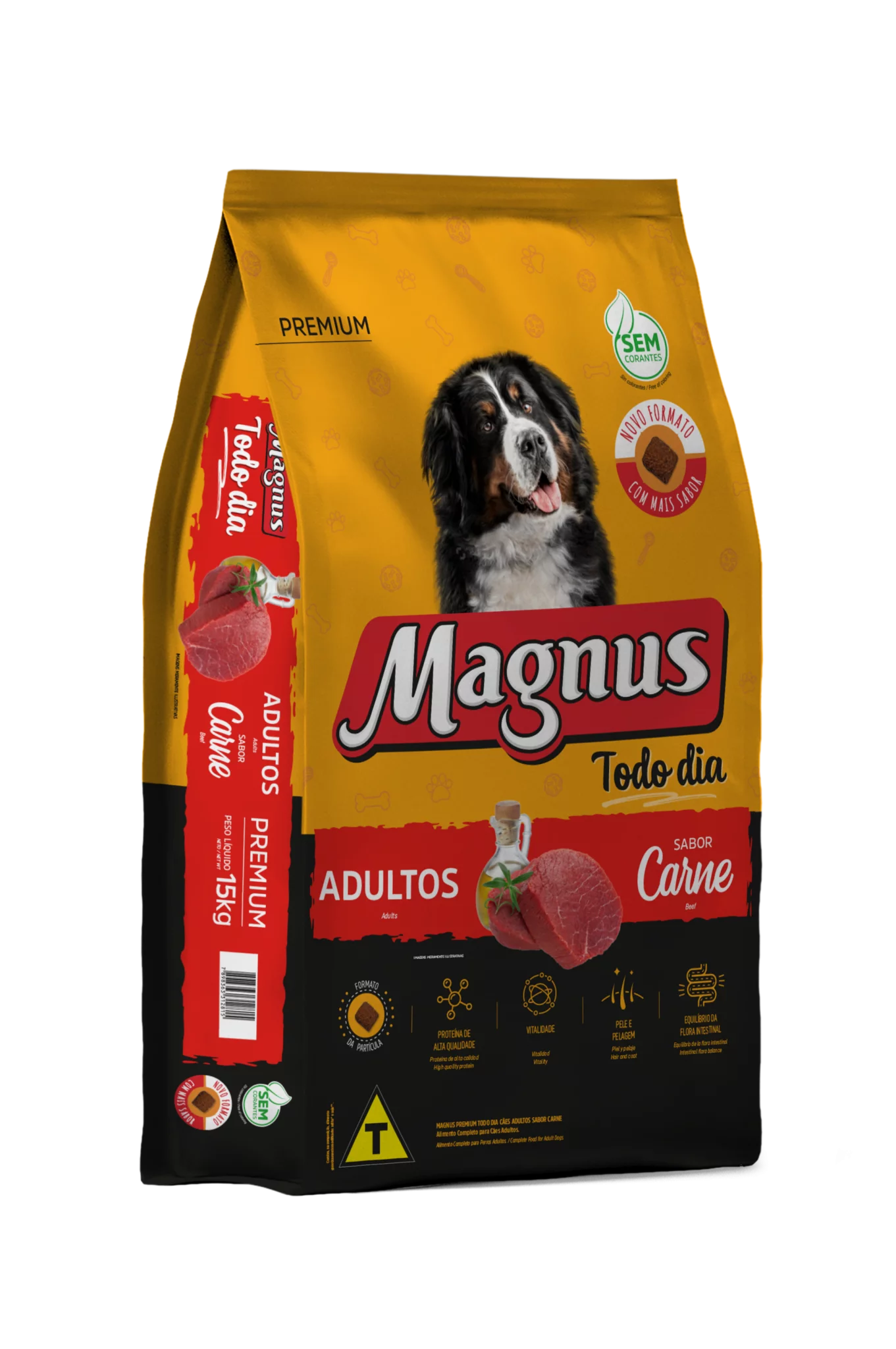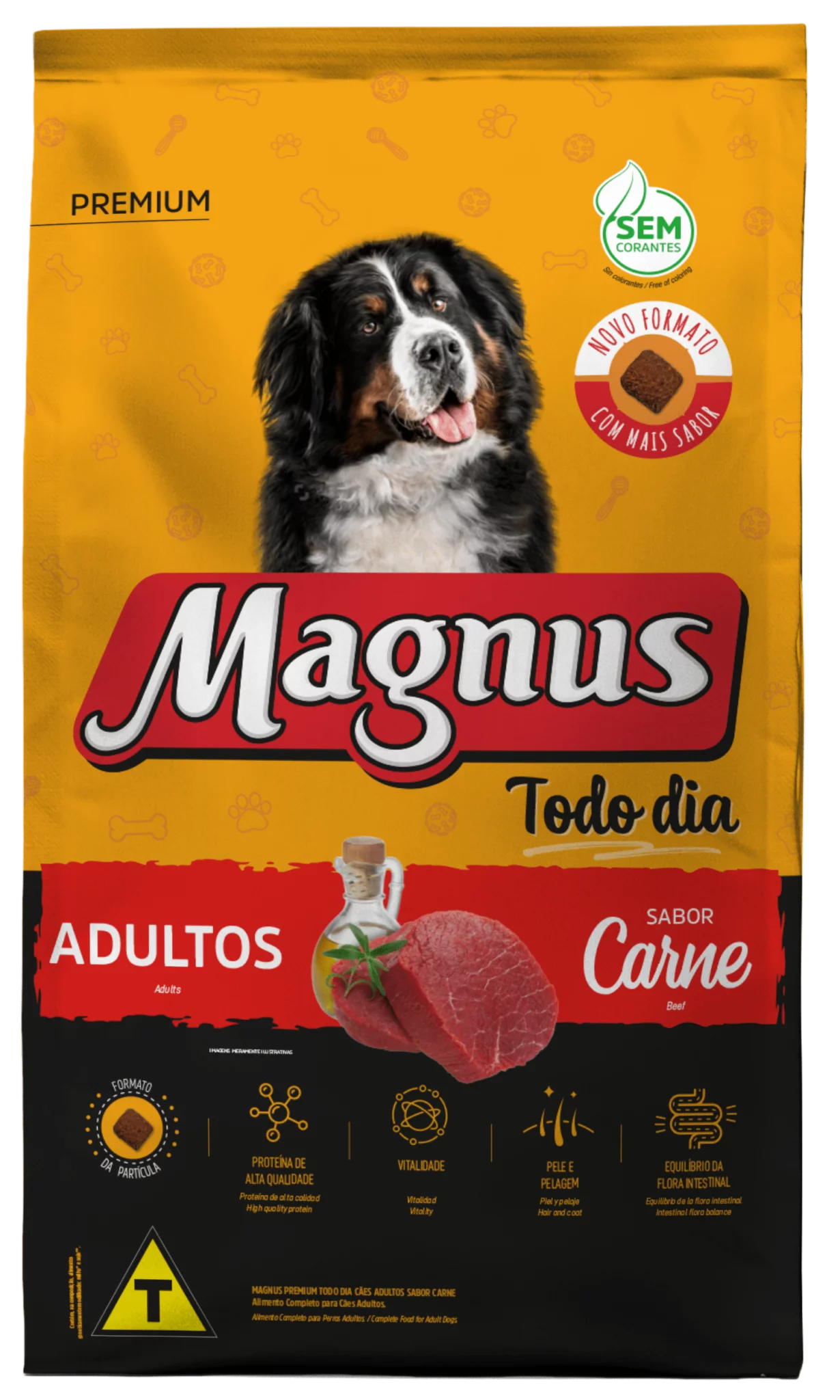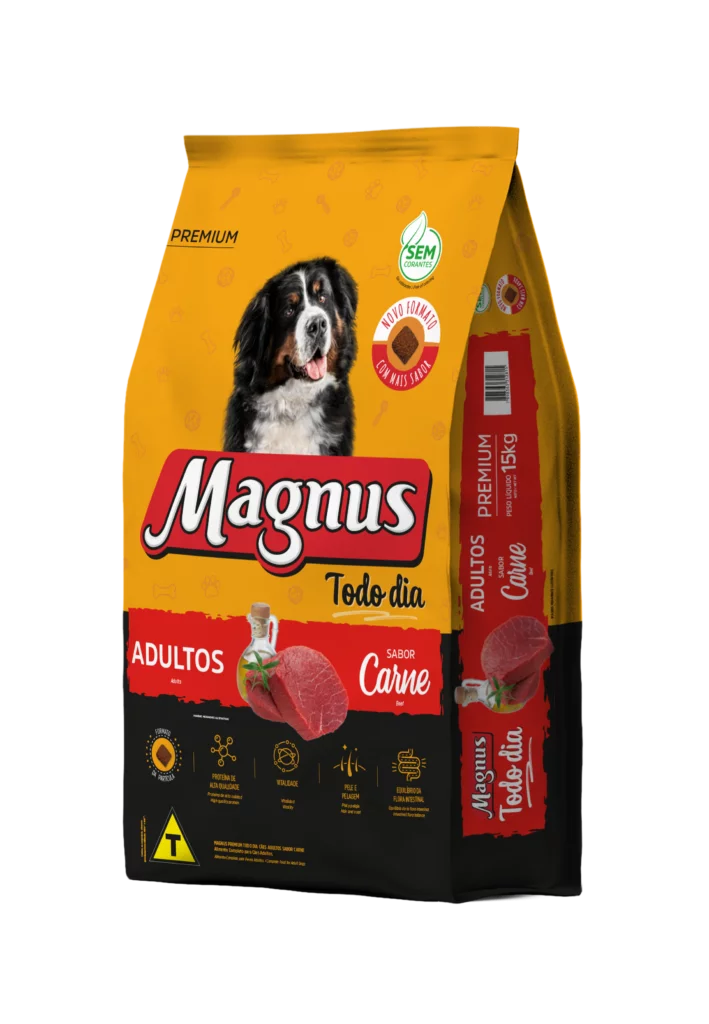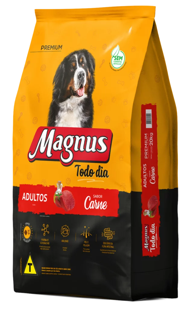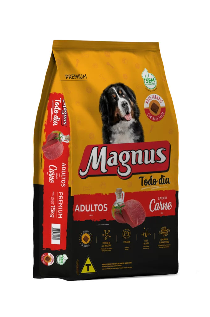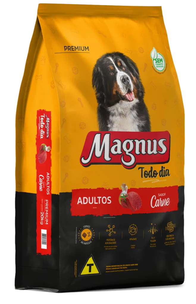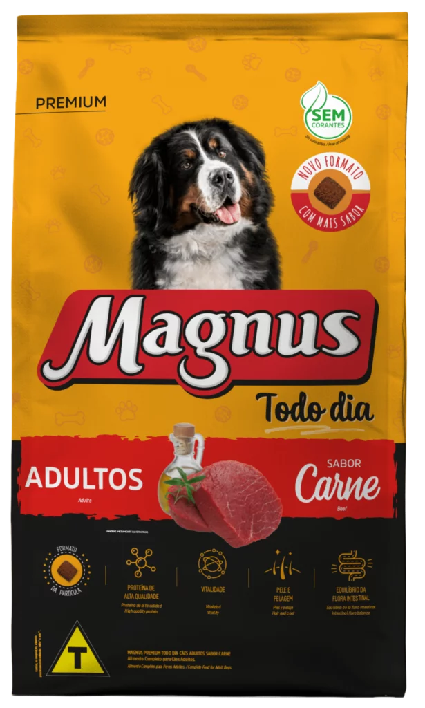 Magnus Premium Todo Dia Cães Adultos Sabor Carne é um alimento premium completo seco, formulado com precisão para atender as exigências do cão adulto, acima de 12 meses, de qualquer raça, em fase de manutenção. Nutritivo e saboroso, agrada ao paladar do cão, provendo benefícios a sua vida. Sem Corantes Artificiais