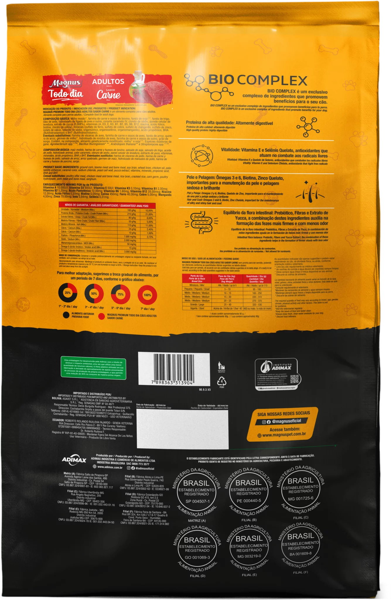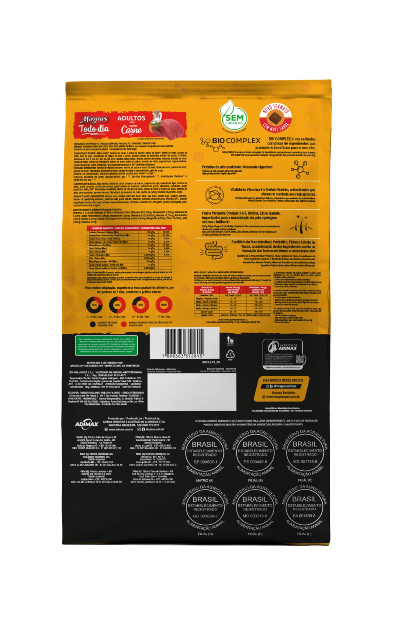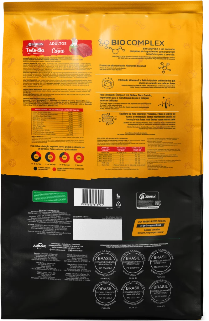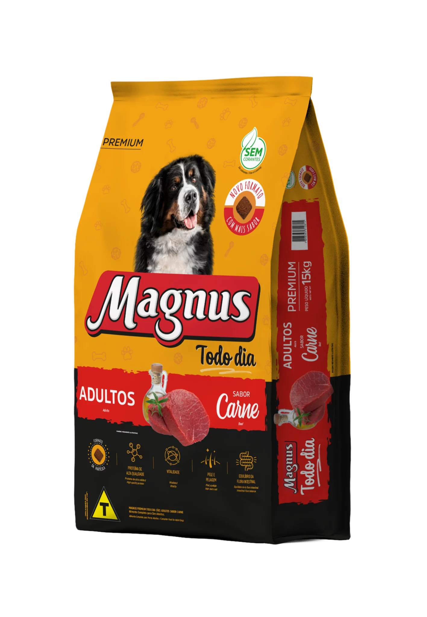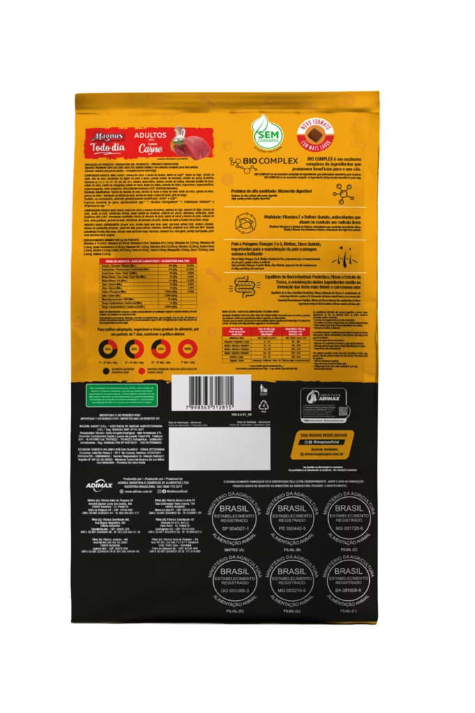 Magnus Premium Todo Dia Cães Adultos Sabor Carne é um alimento premium completo seco, formulado com precisão para atender as exigências do cão adulto, acima de 12 meses, de qualquer raça, em fase de manutenção. Nutritivo e saboroso, agrada ao paladar do cão, provendo benefícios a sua vida. Sem Corantes Artificiais