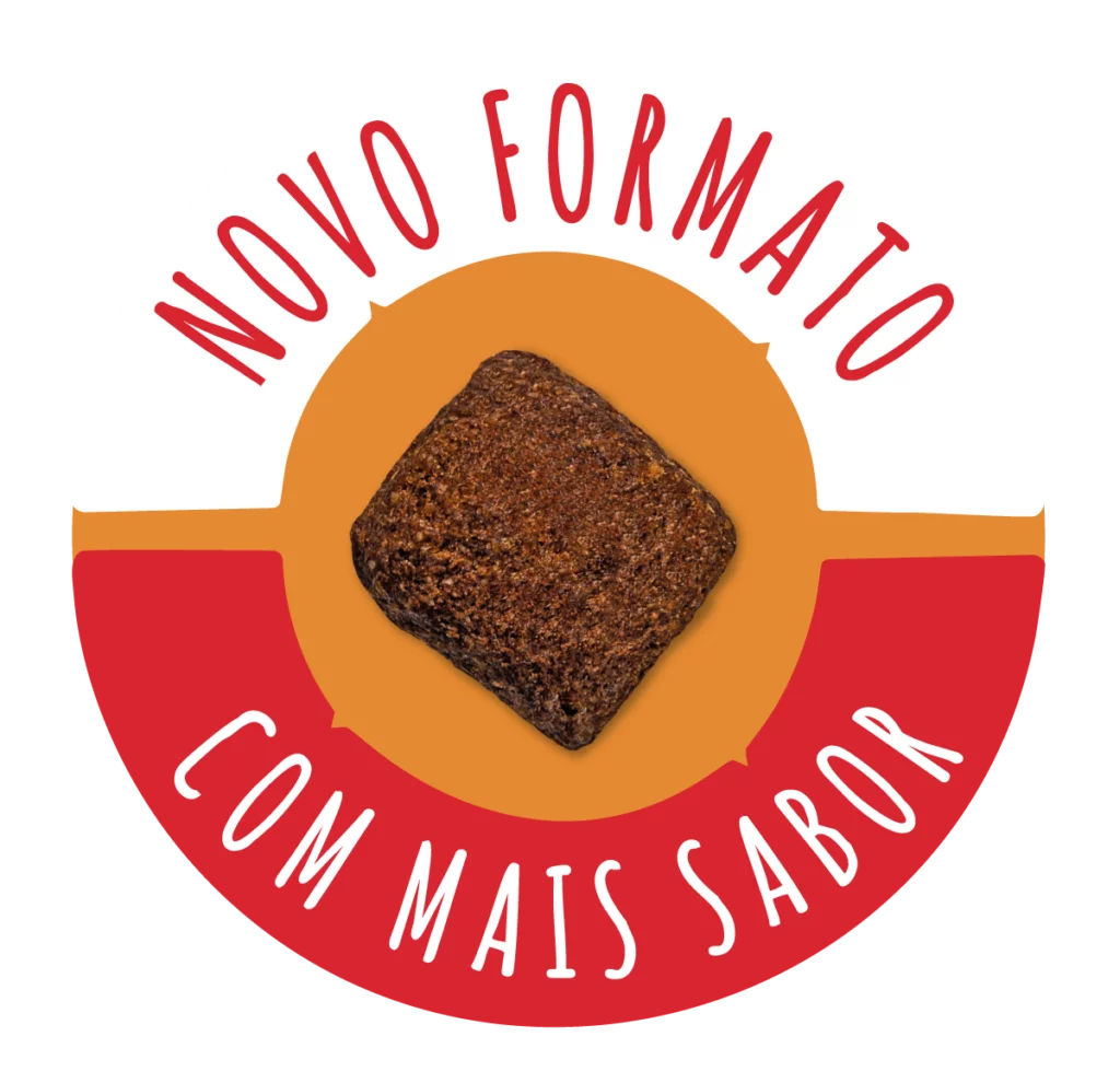 Milho moído*, farinha de carne e ossos de bovino, farelo de soja**, farelo de trigo, cloreto de sódio, óleo de aves, hidrolisado de fígado de aves e suíno, parede celular de levedura, extrato de yucca (0,008%), vitaminas (A, D3, E, K3, B1, B2, B5, B6, B12, niacina, ácido fólico, biotina, cloreto de colina), minerais (sulfato de ferro, sulfato de cobre, sulfato de manganês, sulfato de zinco, iodato de cálcio, selenito de sódio, organozinco, organosselênio, organomanganês), bentonita, ácido propiônico, BHA (Butilhidroxianisol) e BHT (Butilhidroxitolueno). Eventuais substitutivos: carne de aves, carne de bovino, carne de suíno, carne de ovino, carne de peru, carne de frango com ossos, carne de peru com ossos, carne mecanicamente separada de frango, carne mecanicamente separada de bovino, carne mecanicamente separada de salmão, carne mecanicamente separada de peru, miúdos de frango, miúdos de bovinos, miúdos de suínos, miúdos de ovinos, miúdos de peru, farinha de vísceras de aves, farinha de vísceras com ossos, farinha de vísceras de peru, farinha de carne de aves, farinha de carne de bovino, farinha de carne e ossos de aves, farinha de carne e ossos de suíno, farinha de carne e ossos de ovino, farinha de peixes, farinha de torresmo, ovo em pó, concentrado proteico de soro de leite, proteína hidrolisada de frango, óleo refinado de peixe, óleo de girassol refinado, óleo de linhaça, sebo bovino, colágeno hidrolisado, sulfato de condroitina, sulfato de glicosamina, farinha de batata-doce, farinha de mandioca, farinha de ervilha, farinha de linhaça, farinha de arroz, farinha de trigo, fécula de mandioca, fécula de batata, farelo de goiaba, farelo de arroz, farelo de arroz desengordurado, farelo de gérmen de milho*, farelo de glúten de milho*, farelo de glúten de milho 60*, gérmen de milho*, glúten de trigo, triguilho, grão de linhaça, arroz integral, quirera de arroz, feijão moído, grão de sorgo, semente de psyllium, fibra de cana-de-açúcar, aveia, frutas e vegetais desidratados (abóbora, batata-doce, brócolis, cenoura, espinafre, maçã, manga, polpa de beterraba, tomate), cúrcuma, extrato de aloe vera, extratos de alecrim, chá verde e hortelã, extrato de marigold, cloreto de potássio, fosfato bicálcico, carbonato de cálcio, calcário calcítico, hexametafosfato de sódio, hidrolisado de fígado de aves, hidrolisado de miúdos de aves, hidrolisado de fígado de suíno, hidrolisado de miúdos de suíno, extrato de leveduras, levedura de cervejaria inativada desidratada, levedura de cana-de-açúcar hidrolisada e desidratada, levedura de cana-de-açúcar inativada e desidratada, levedura de cana-de-açúcar autolisada e desidratada, levedura hidrolisada desidratada, galactooligossacarídeos, frutooligossacarídeos, inulina, biomassa de microalgas (Schizochytrium sp.), biomassa microbiana (C.glutamicum – KCCM10227), farinha de alga marrom (Ascophyllum nodosum), zeolita, celulose em pó, ácido cítrico, ácido fosfórico, cloreto de amônio, sulfato de amônio, aluminossilicato de cálcio e sódio, extrato de cardo mariano, L-carnitina, taurina, lisina, metionina, triptofano, vitamina (C), concentrado de tocoferóis. Contém, na composição, alimento geneticamente modificado: milho* e soja**.