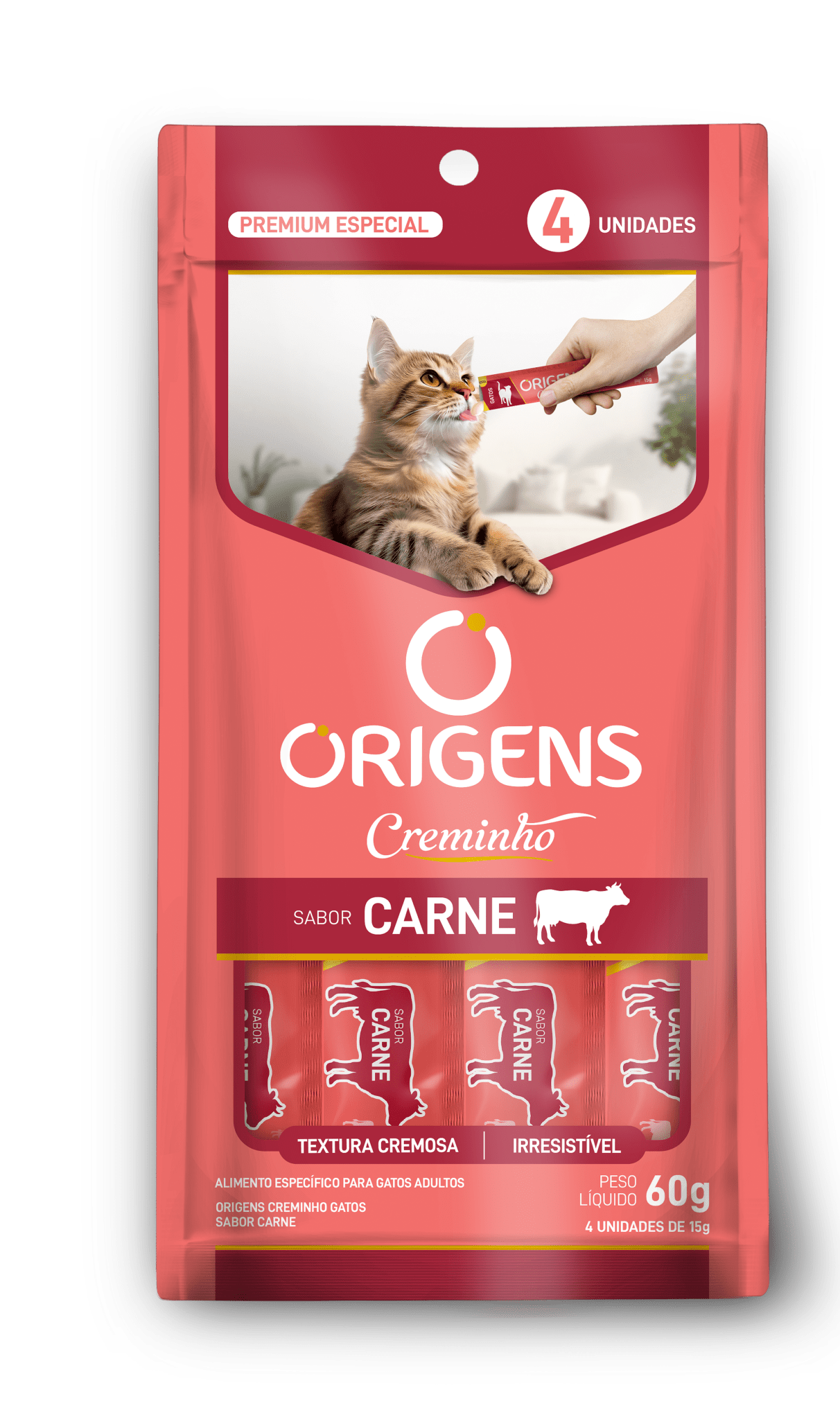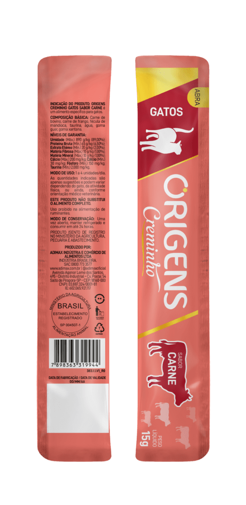 15g4x15g (pacote)Origens Creminho é uma linha de petiscos com textura cremosa que vai proporcionar momentos únicos de interação entre o tutor e seu gato! Os produtos Origens Creminho foram formulados com ingredientes selecionados e de alta qualidade, como as carnes frescas, que estimulam o apetite do gato e agradam os paladares mais exigentes. Além disso, são petiscos saudáveis, formulados sem a inclusão de grãos, ingredientes transgênicos ou corantes e conservantes artificiais. Com alto teor de umidade, Origens Creminho ainda favorece uma maior ingestão de água e tem baixa caloria. Origens creminho está disponível em três opções de sabores irresistíveis: carne, frango e salmão.