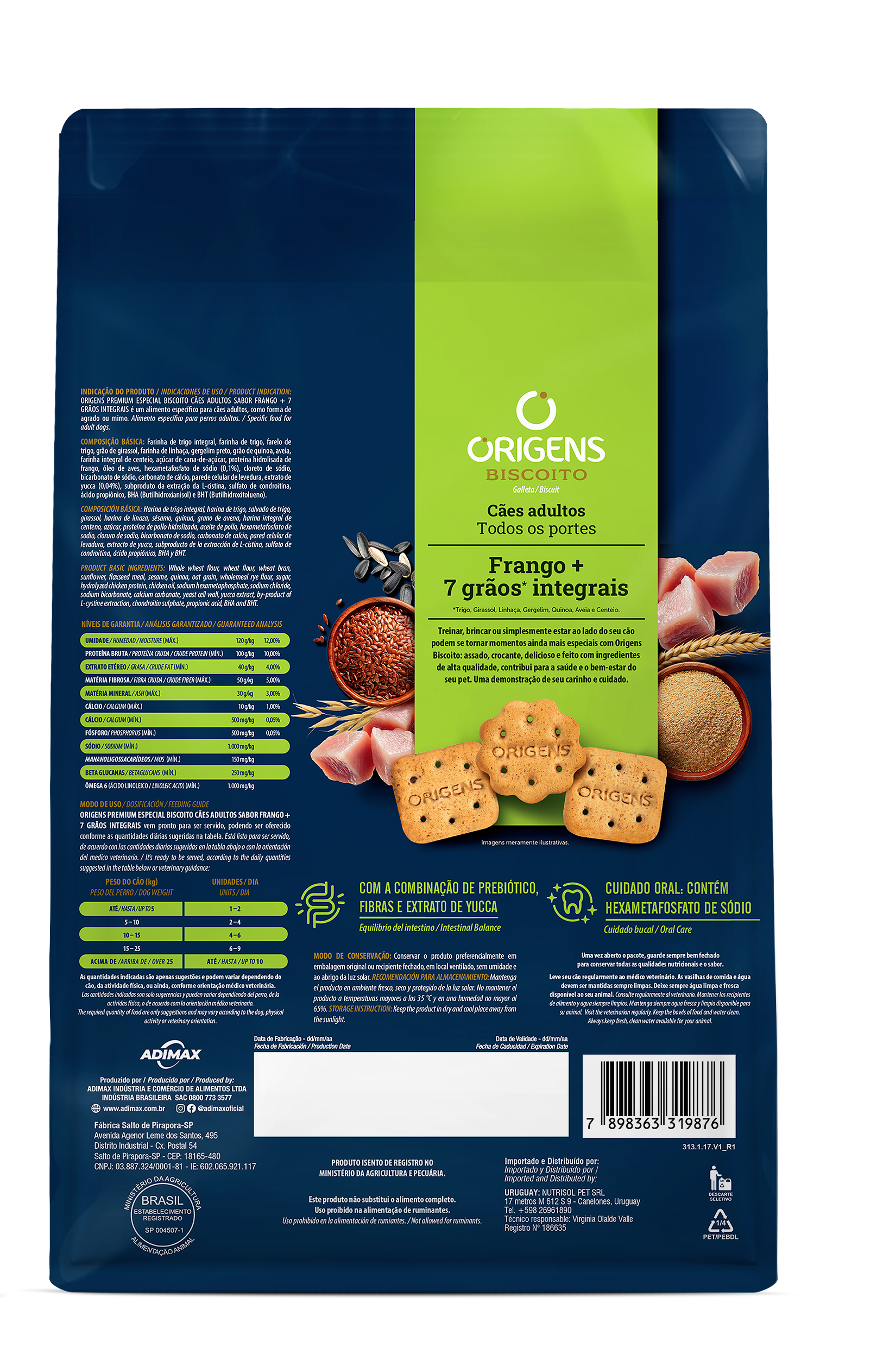 Farinha de trigo integral, farinha de trigo, farelo de trigo, grão de girassol, farinha de linhaça, gergelim preto, grão de quinoa, aveia, farinha integral de centeio, óleo de aves, proteína hidrolisada de frango, açúcar de cana-de-açúcar, parede celular de levedura, extrato de yucca (0,04%), hexametafosfato de sódio (0,1%), subproduto da extração da L-cistina, sulfato de condroitina (0,01%), cloreto de sódio, carbonato de cálcio, ácido propiônico, BHA (Butilhidroxianisol) e BHT (Butilhidroxitolueno).
