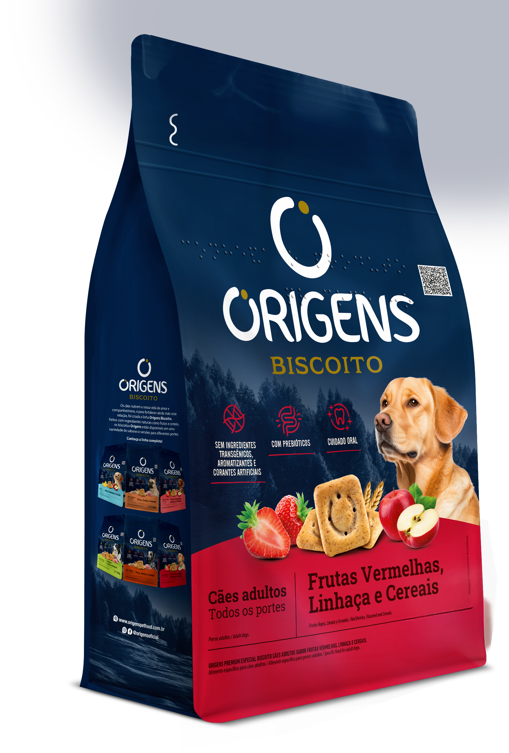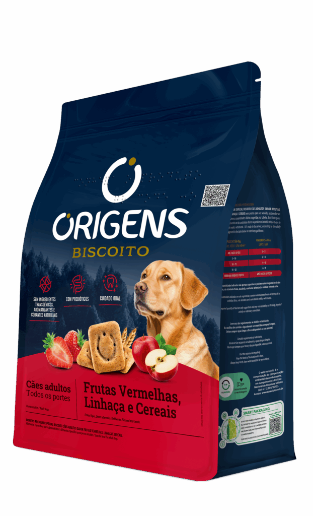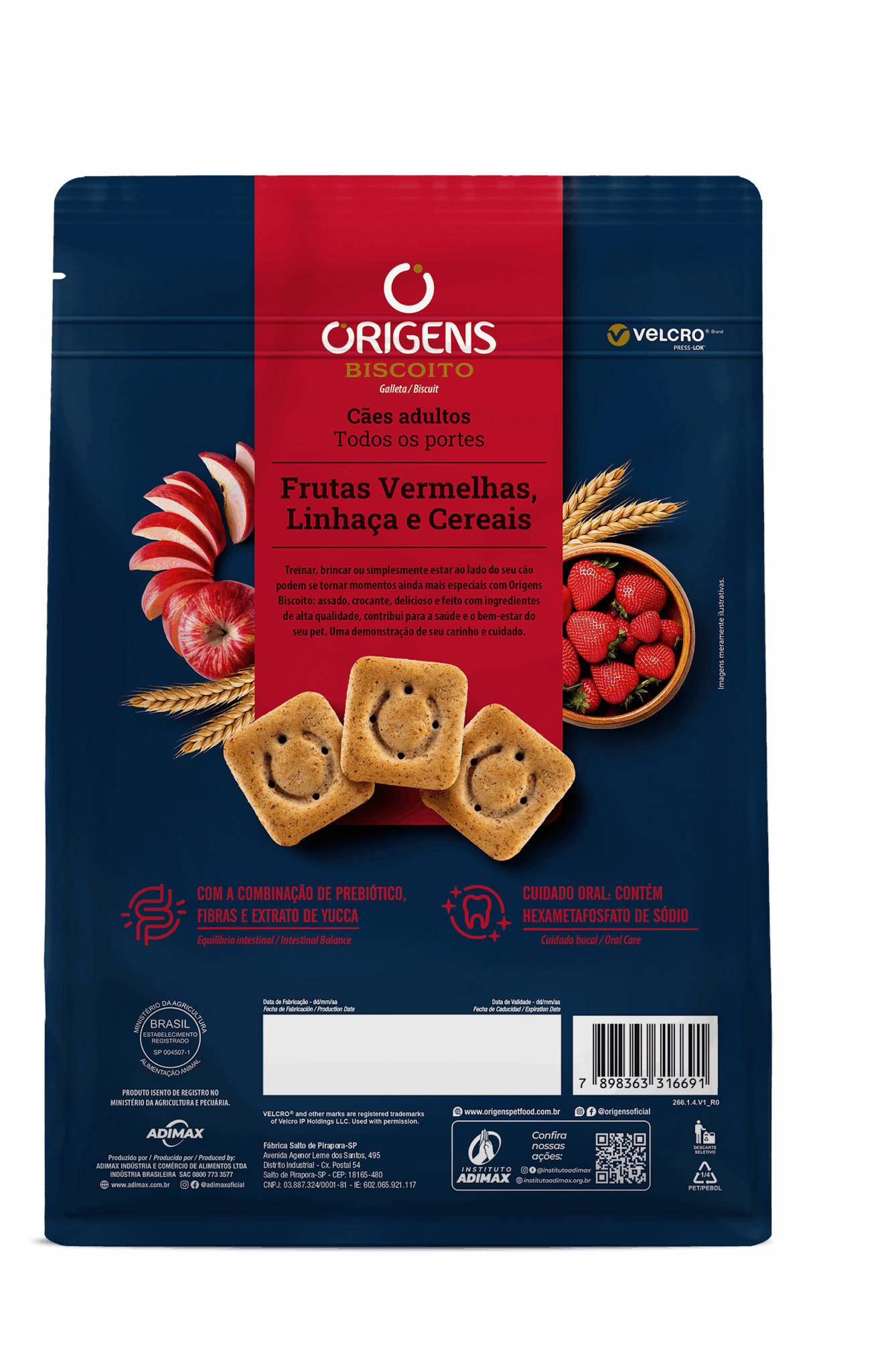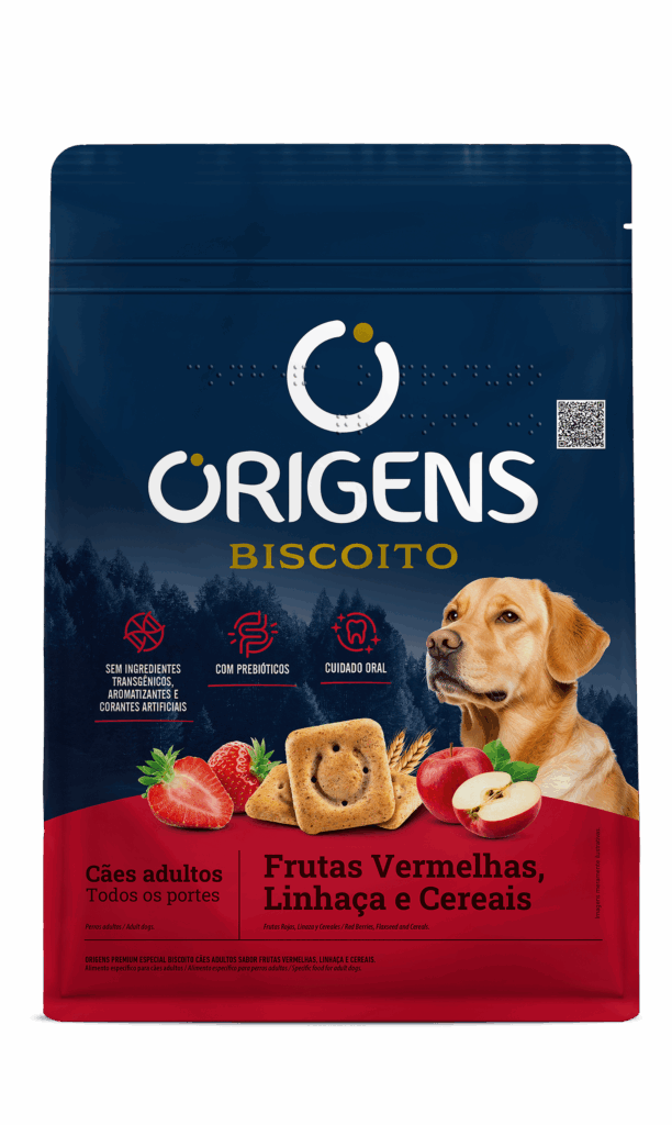 Origens Biscoito é uma linha de alta qualidade para cães filhotes e adultos. Indicado como recompensa e agrado, os biscoitos Origens oferecem variedade de sabores e podem ser encontrados em versões para diferentes portes. É um petisco saudável e saboroso com ingredientes como banana, maçã, aveia, frutas vermelhas, linhaça, peru e cereais.
