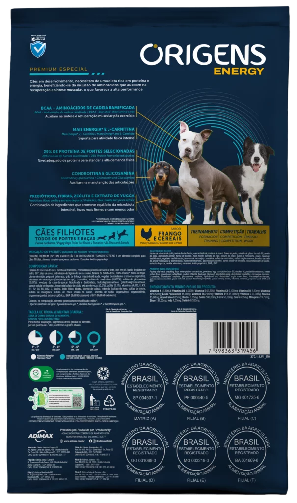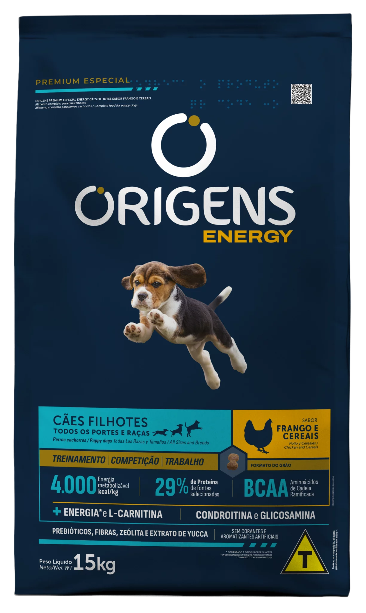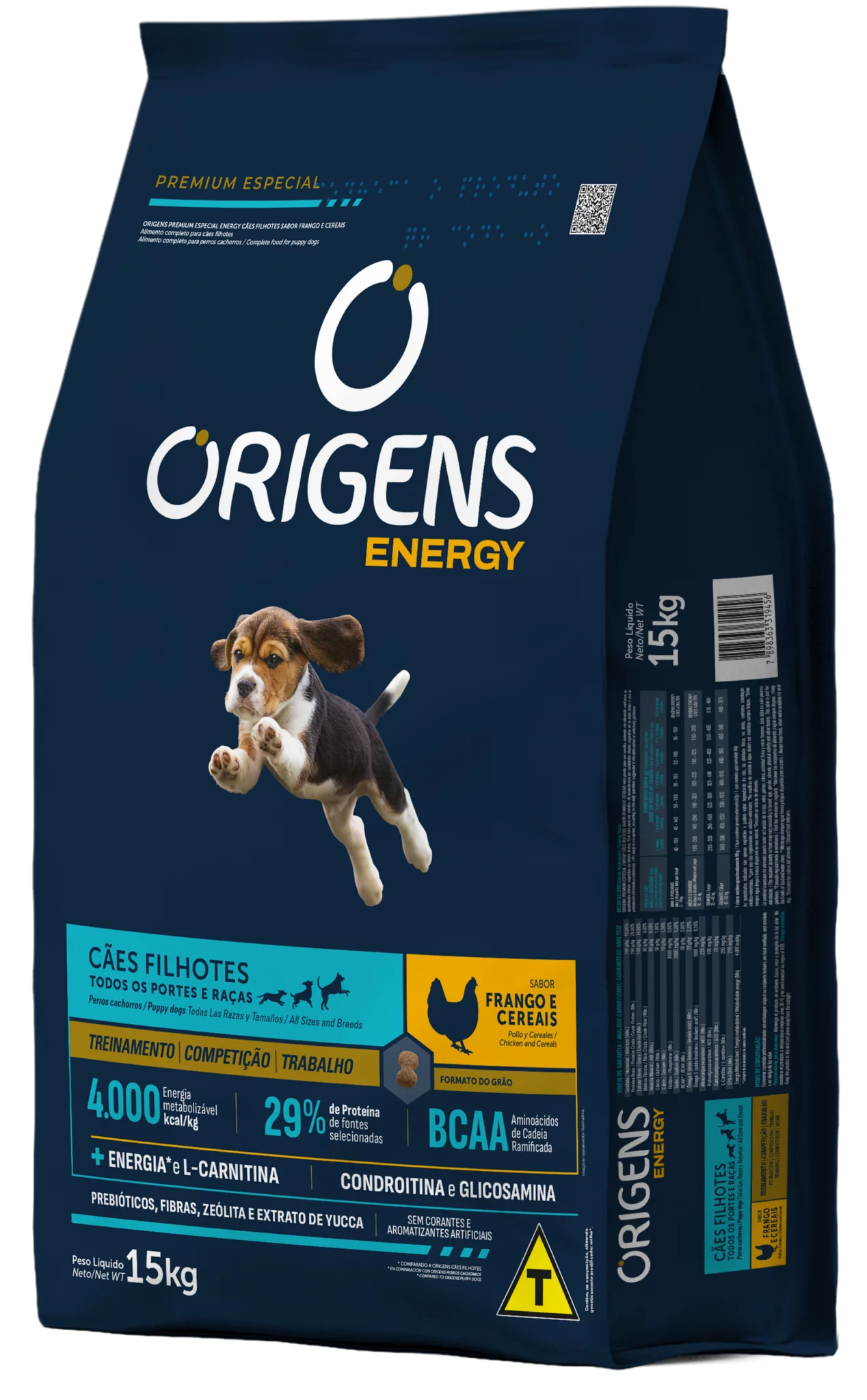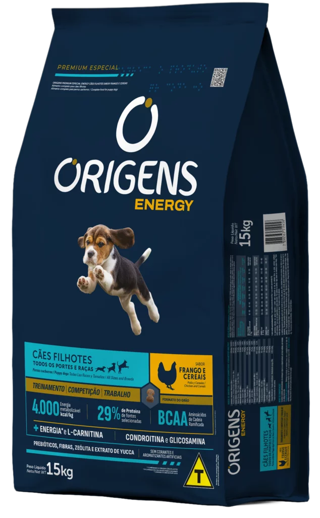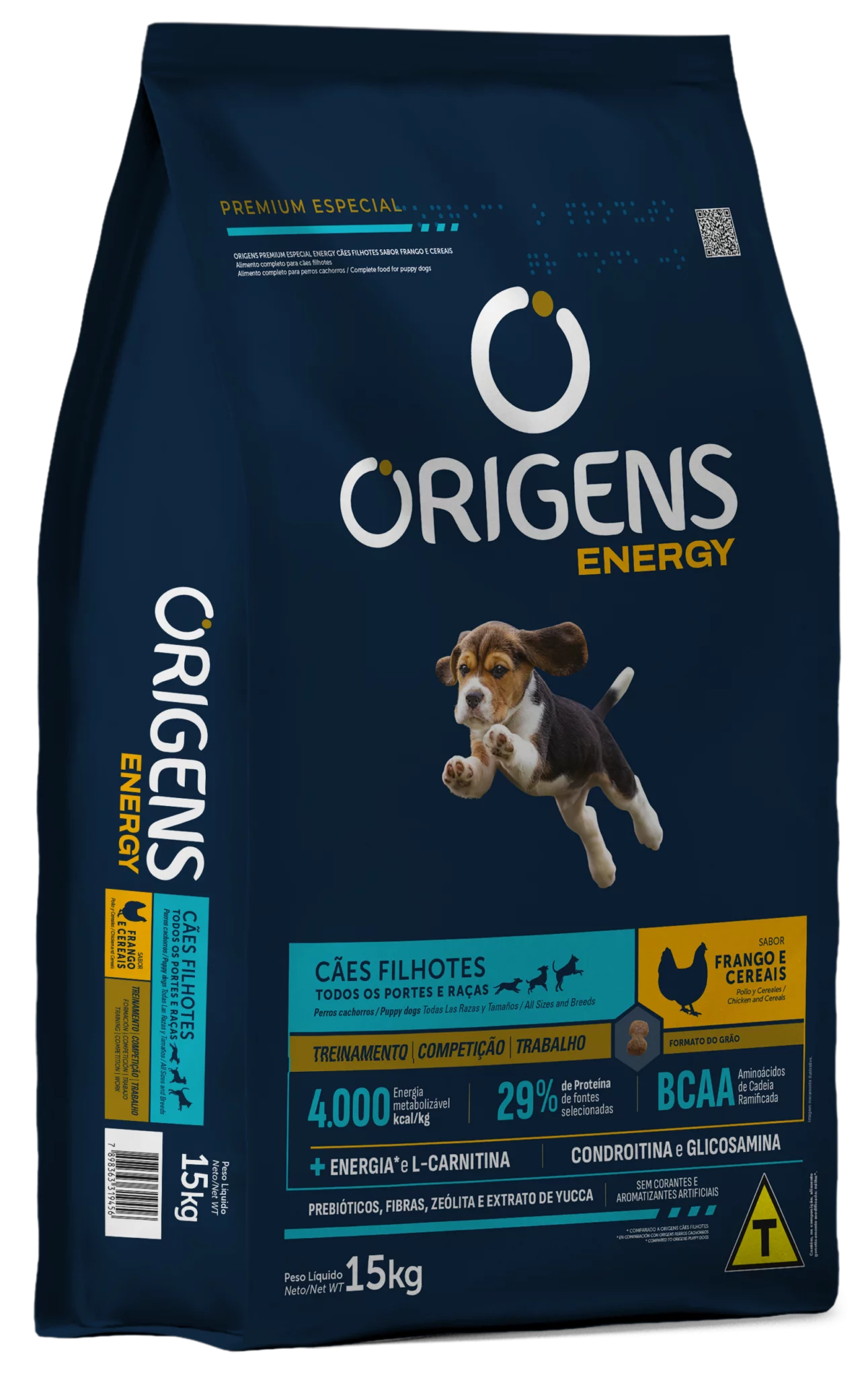 15 kgOrigens Energy Filhotes é indicada para cães em desenvolvimento, que necessitam de uma dieta rica em proteína e energia, beneficiando-se da inclusão de aminoácidos que auxiliam na recuperação e síntese muscular, o que favorece a alta performance.