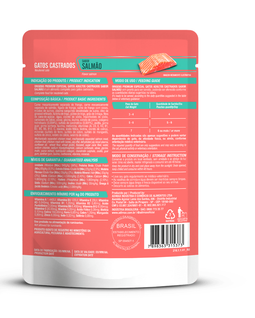 Carne mecanicamente separada de frango, carne mecanicamente separada de salmão, fígado de frango, carne de frango com ossos, miúdos de suínos, plasma sanguíneo desidratado de suíno, óleo de girassol refinado, farinha de trigo, glúten de trigo, grão de linhaça, fibra de cana-de-açúcar, água, cloreto de sódio, tripolifosfato de sódio, carbonato de cálcio, xilose, glicina, inulina, extrato de yucca, colágeno hidrolisado (0,004%), sulfato de condroitina (0,001%), zeolita, goma guar, goma xantana, taurina, metionina, vitaminas (A, D3, E, K3, B1, B2, B5, B6, B12, C, niacina, ácido fólico, biotina, cloreto de colina), minerais (sulfato de ferro, sulfato de cobre, sulfato de manganês, sulfato de zinco, iodato de cálcio, selenito de sódio).