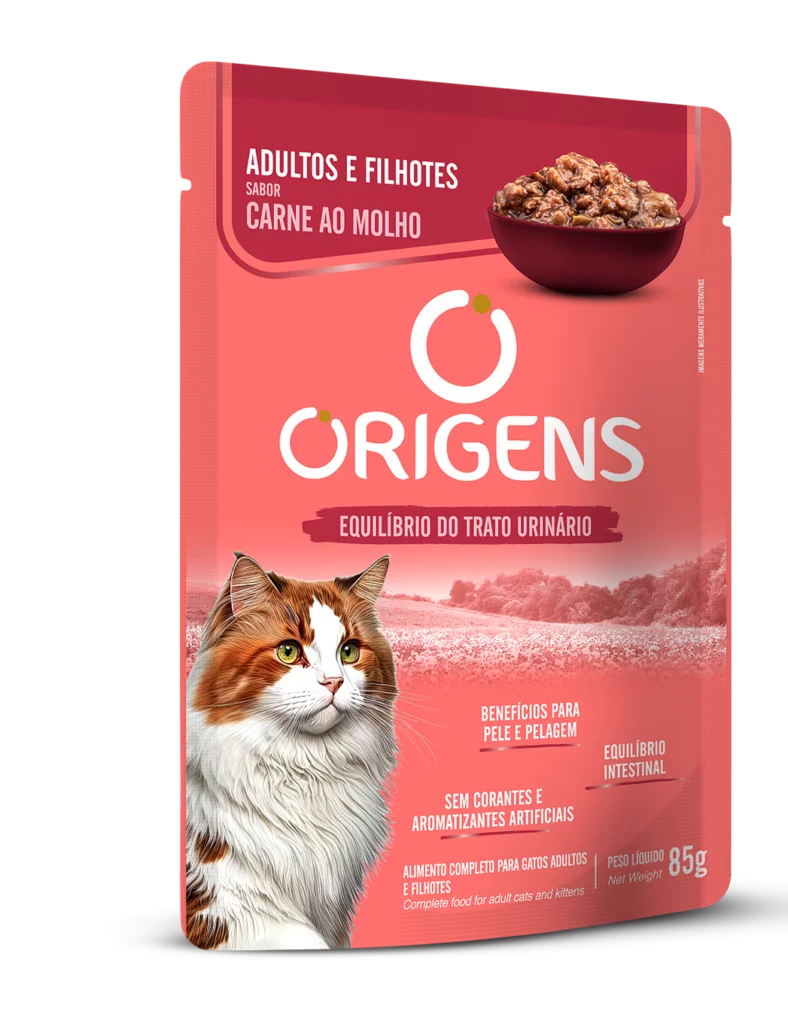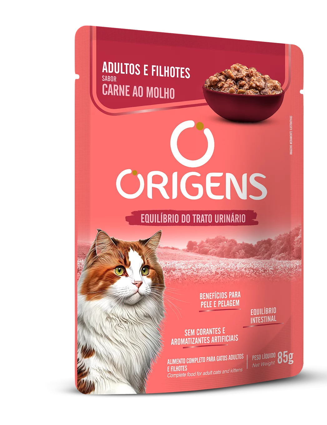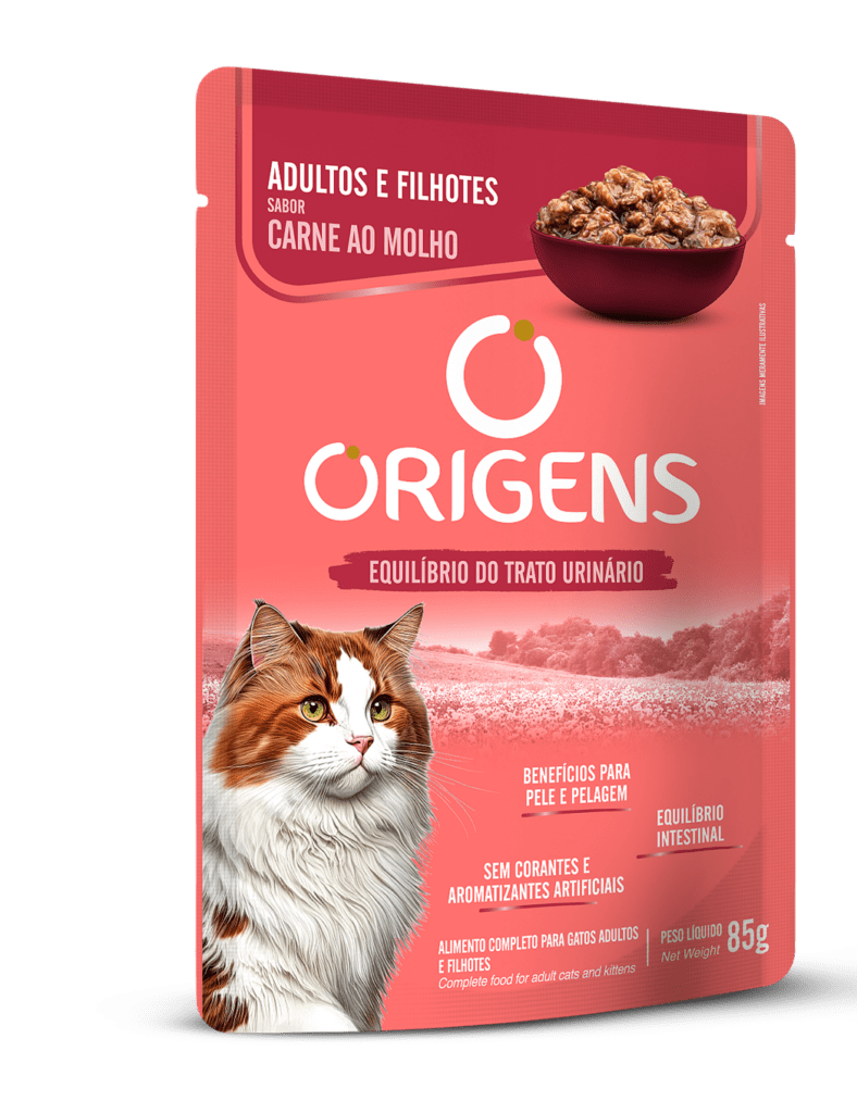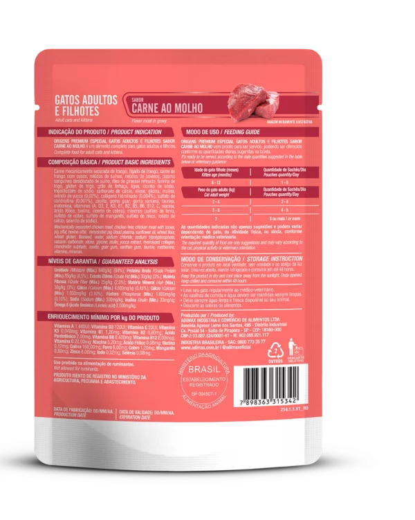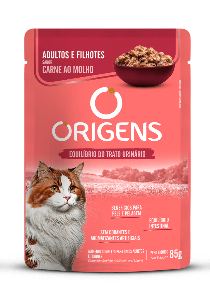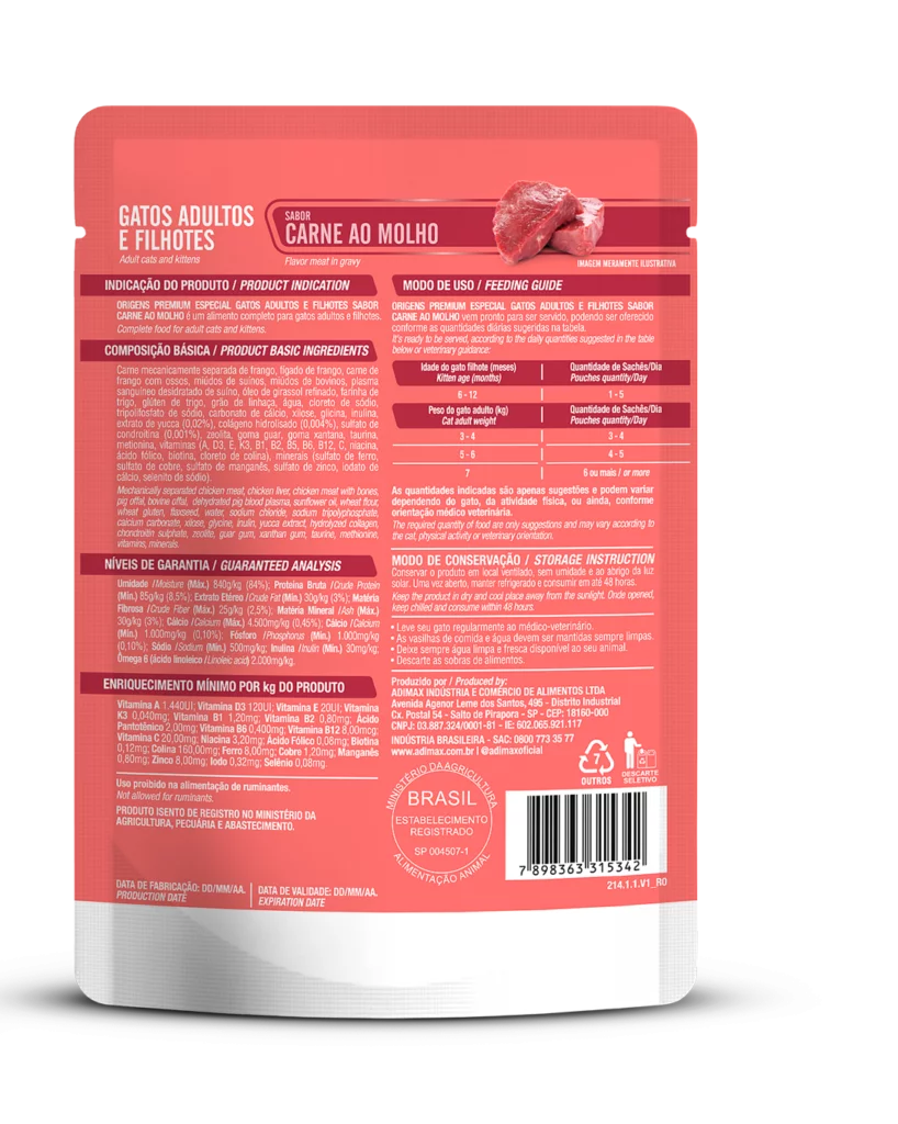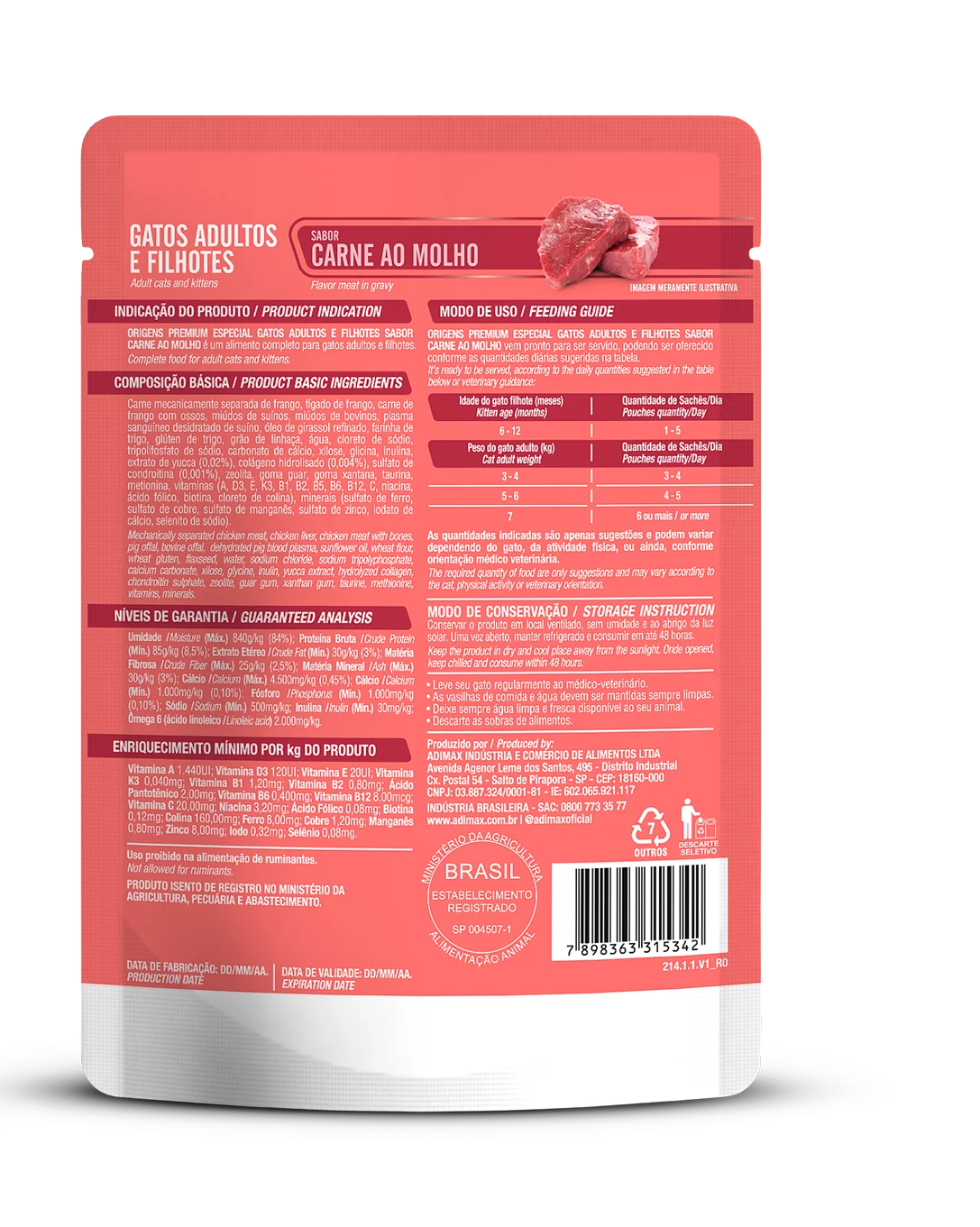 Carne mecanicamente separada de frango, fígado de frango, carne de frango com ossos, miúdos de suínos, miúdos de bovinos, plasma sanguíneo desidratado de suíno, óleo de girassol refinado, farinha de trigo, glúten de trigo, grão de linhaça, água, cloreto de sódio, tripolifosfato de sódio, carbonato de cálcio, xilose, glicina, inulina, extrato de yucca (0,02%), colágeno hidrolisado (0,004%), sulfato de condroitina (0,001%), zeolita, goma guar, goma xantana, taurina, metionina, vitaminas (A, D3, E, K3, B1, B2, B5, B6, B12, C, niacina, ácido fólico, biotina, cloreto de colina), minerais (sulfato de ferro, sulfato de cobre, sulfato de manganês, sulfato de zinco, iodato de cálcio, selenito de sódio).