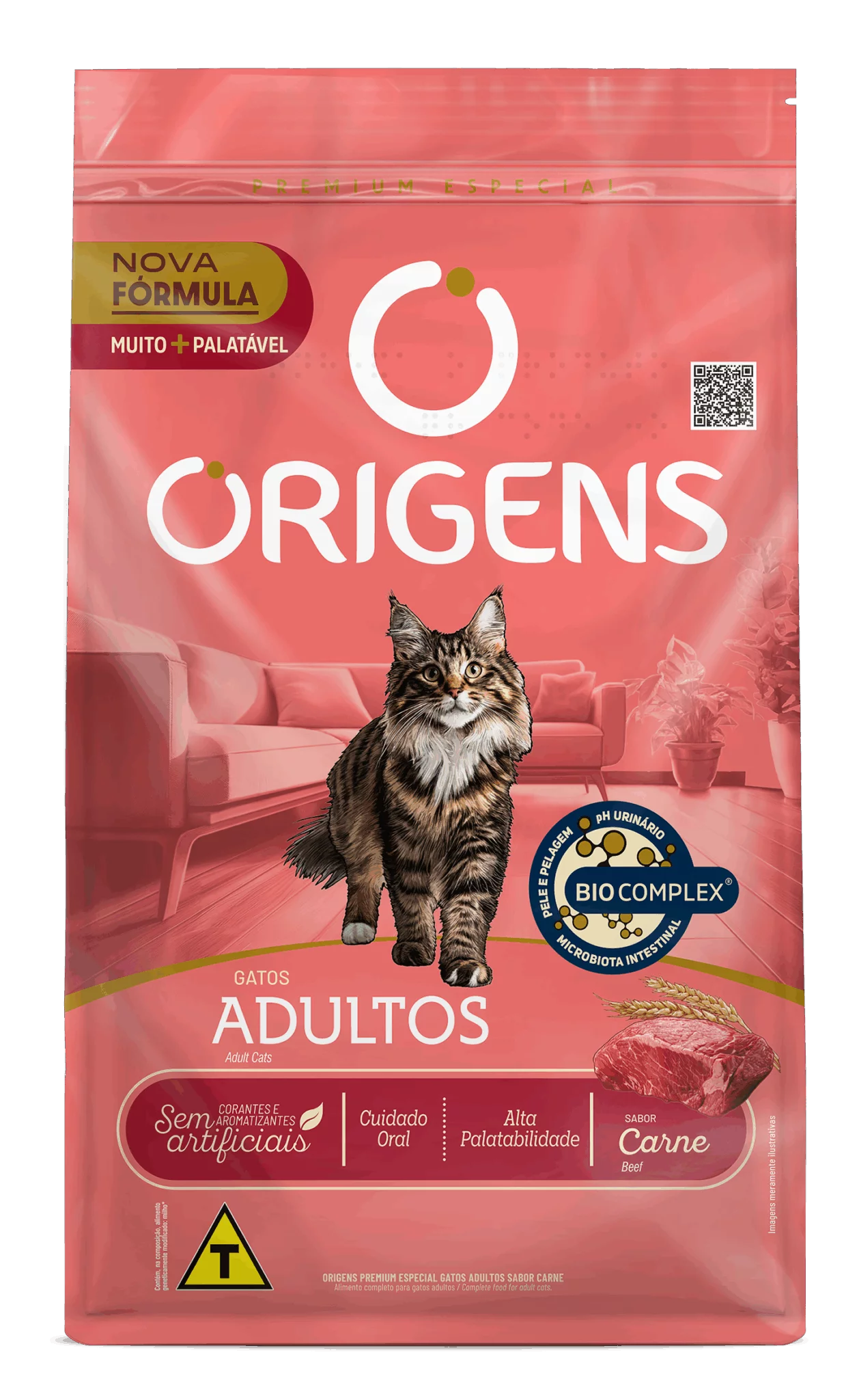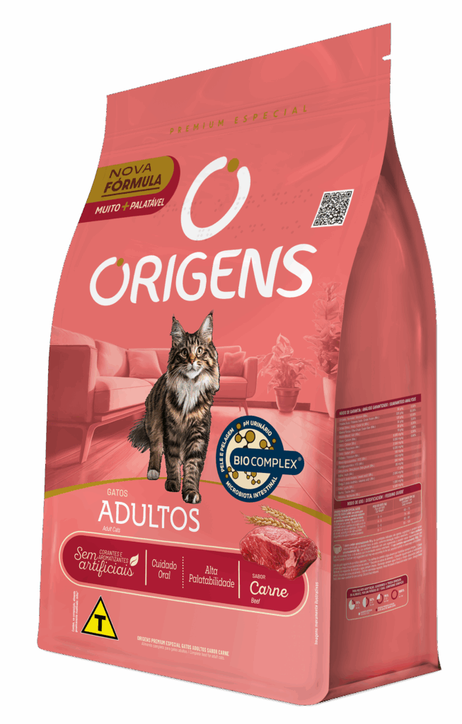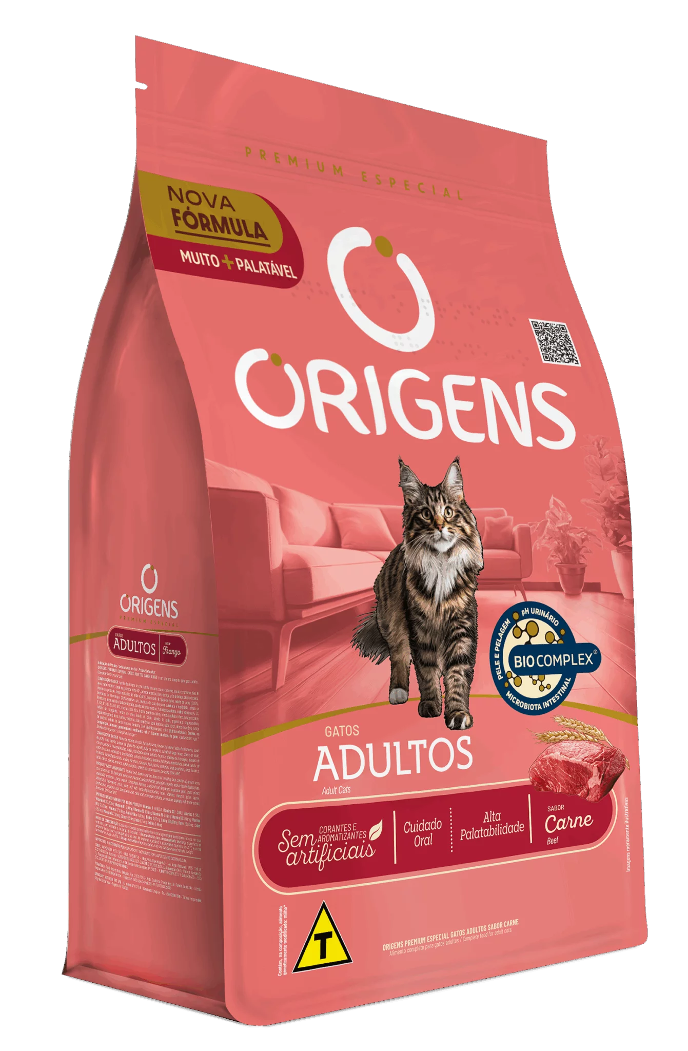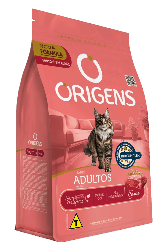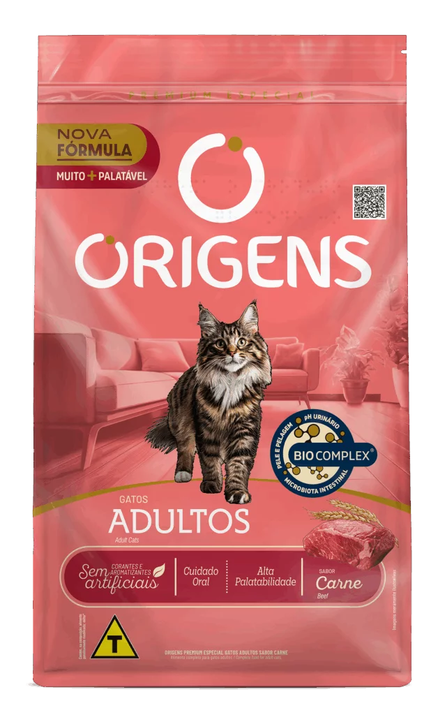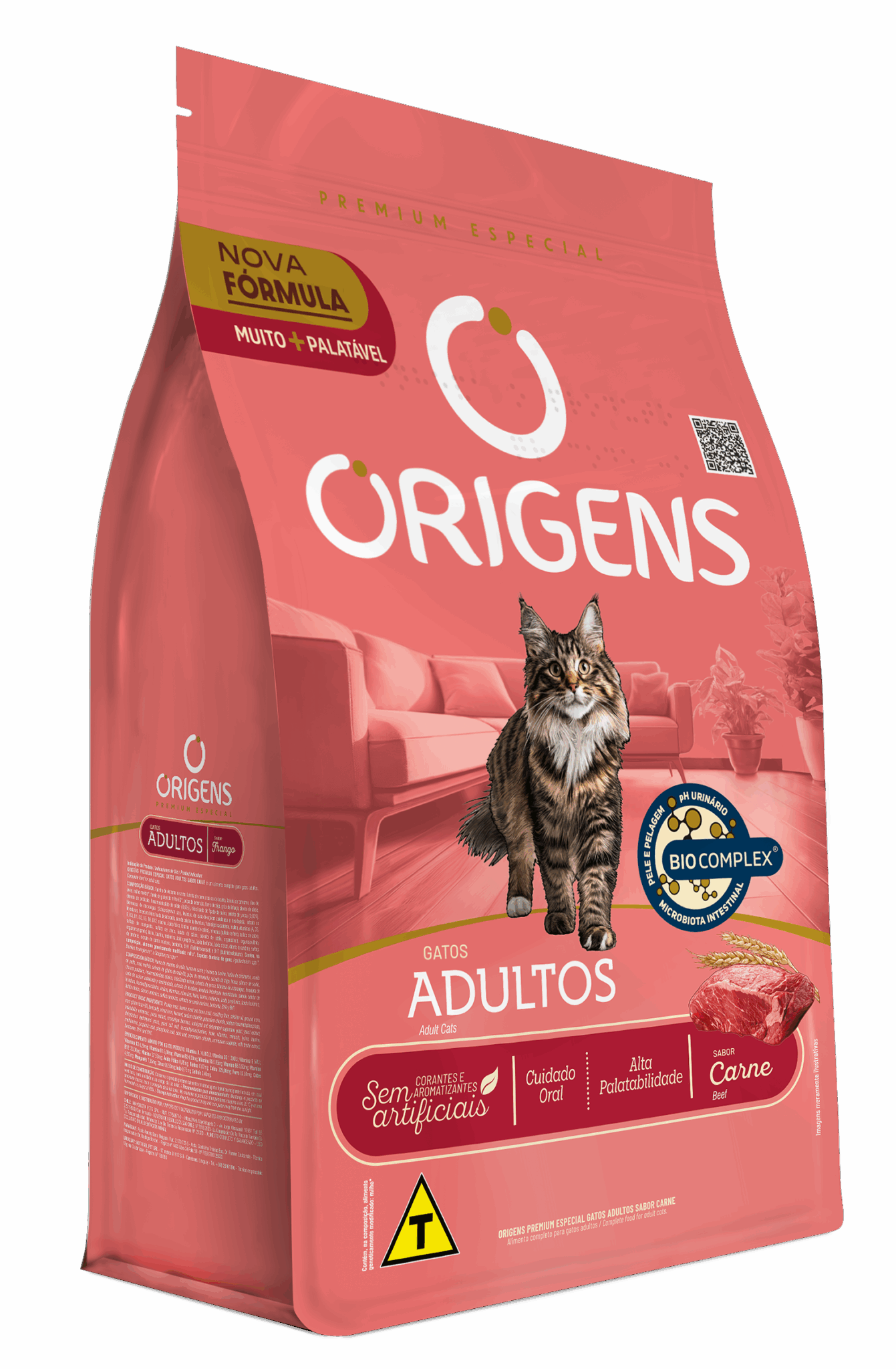 Origens é uma linha de alimentos Premium Especial que nutre o que há de melhor: o amor. Promover saúde e prazer a cada refeição é antes de tudo um ato de carinho, que estreita laços e prolonga os dias de alegria, amizade e amor incondicional entre tutores e seus cães e gatos. Origens Gatos Adultos Sabor Carne possui ingredientes de alta qualidade e não contém corantes e aromatizantes artificiais. Indicado para gatos ativos e sem tendência a engordar.