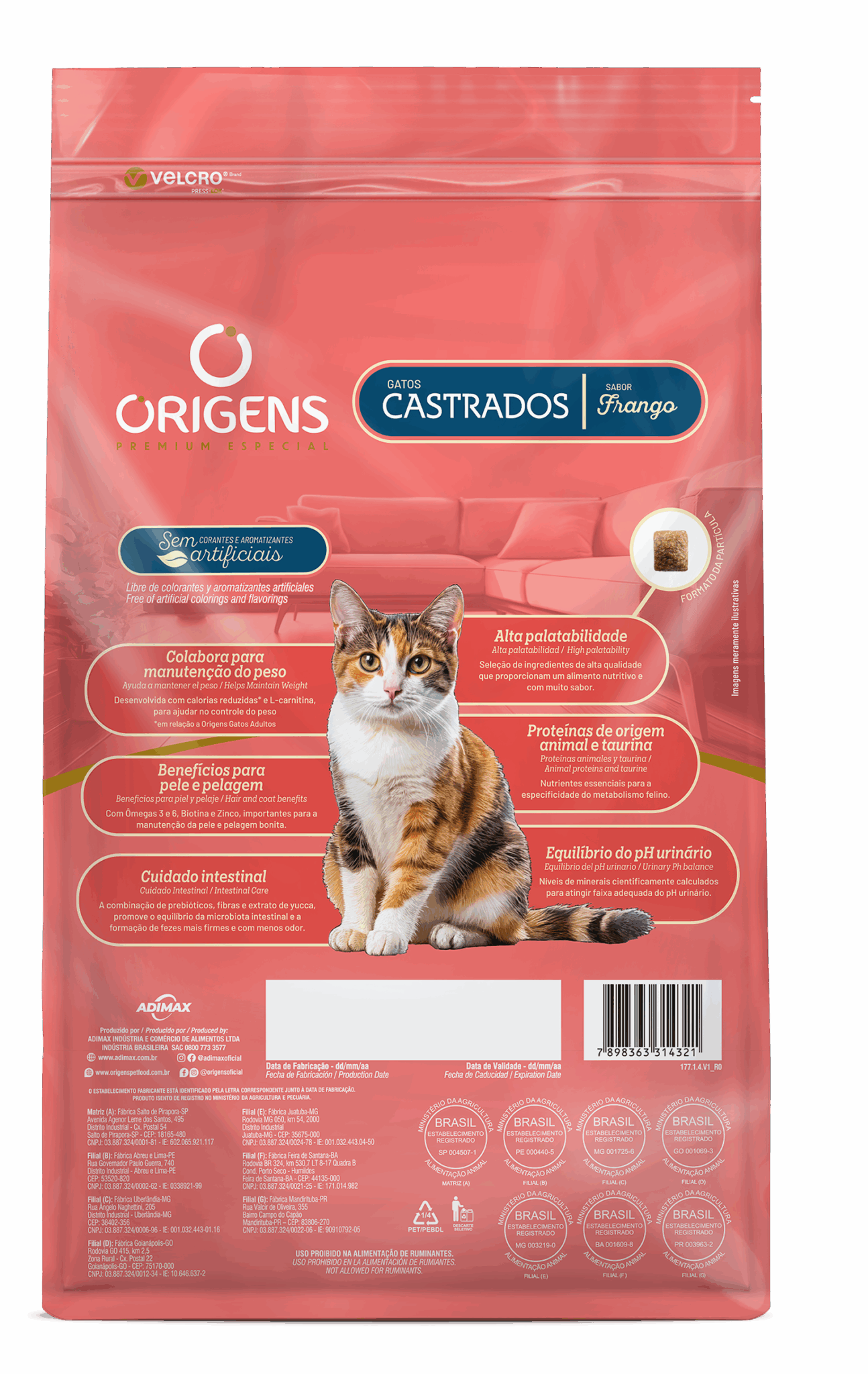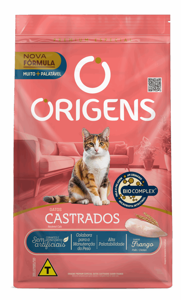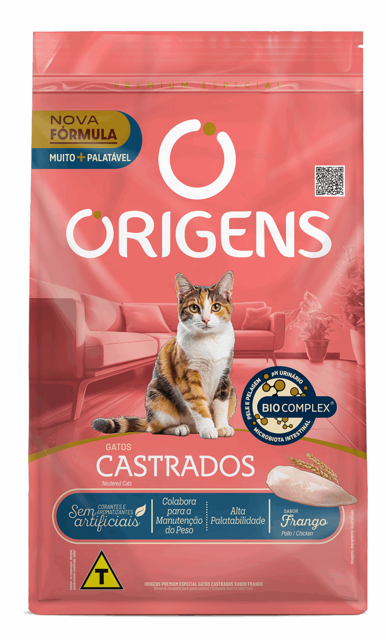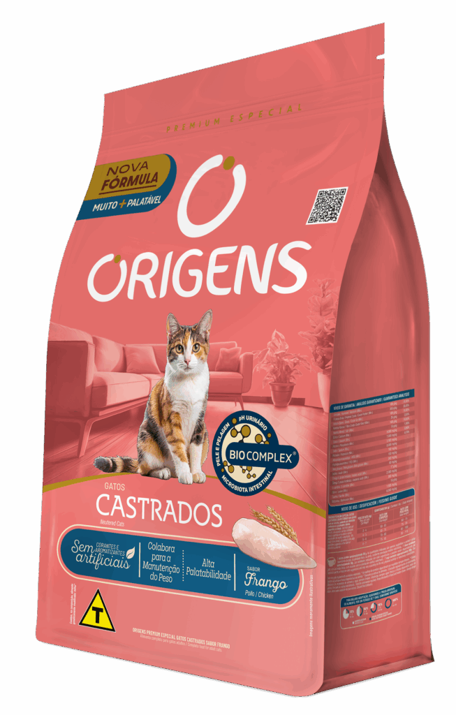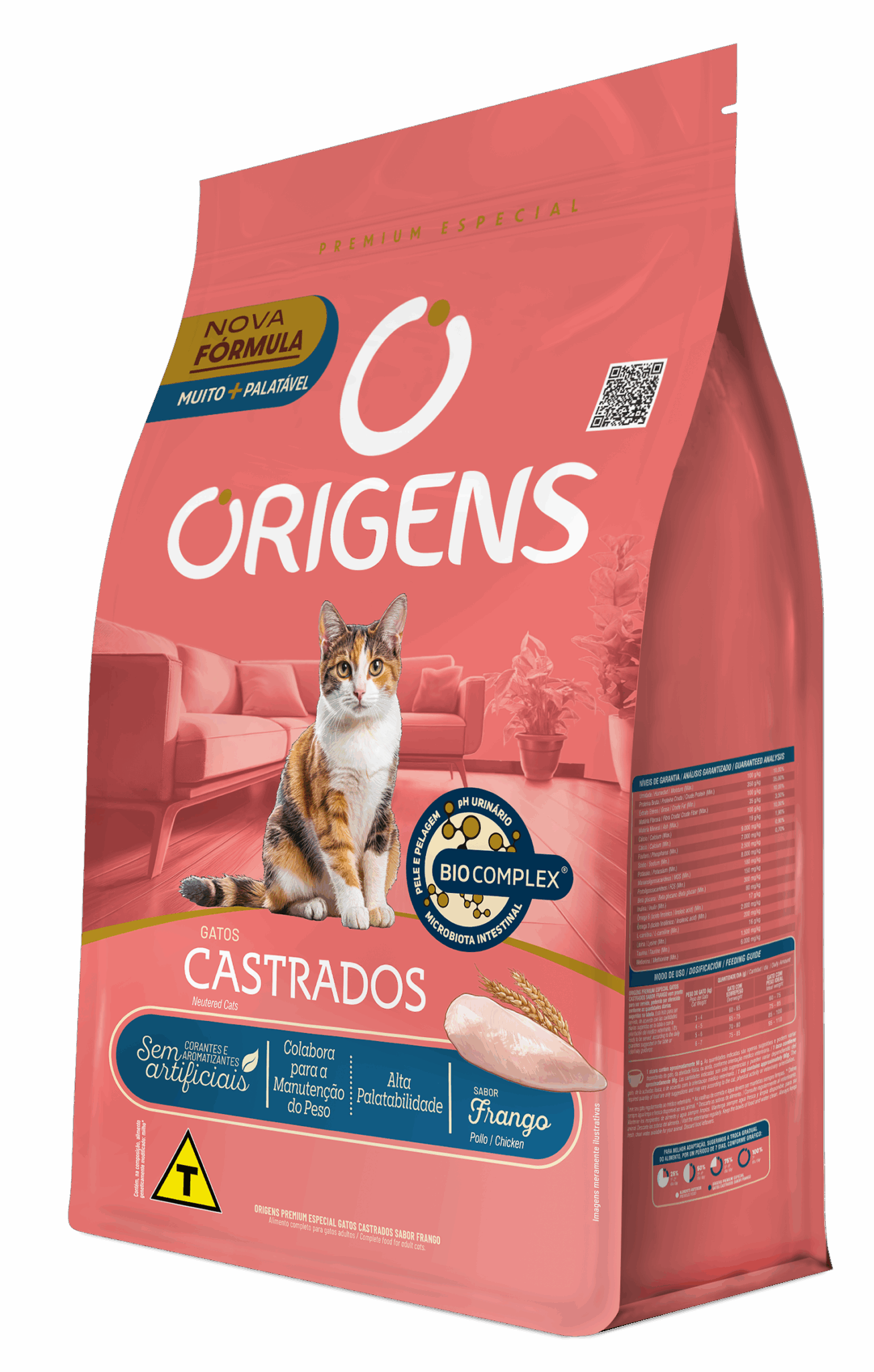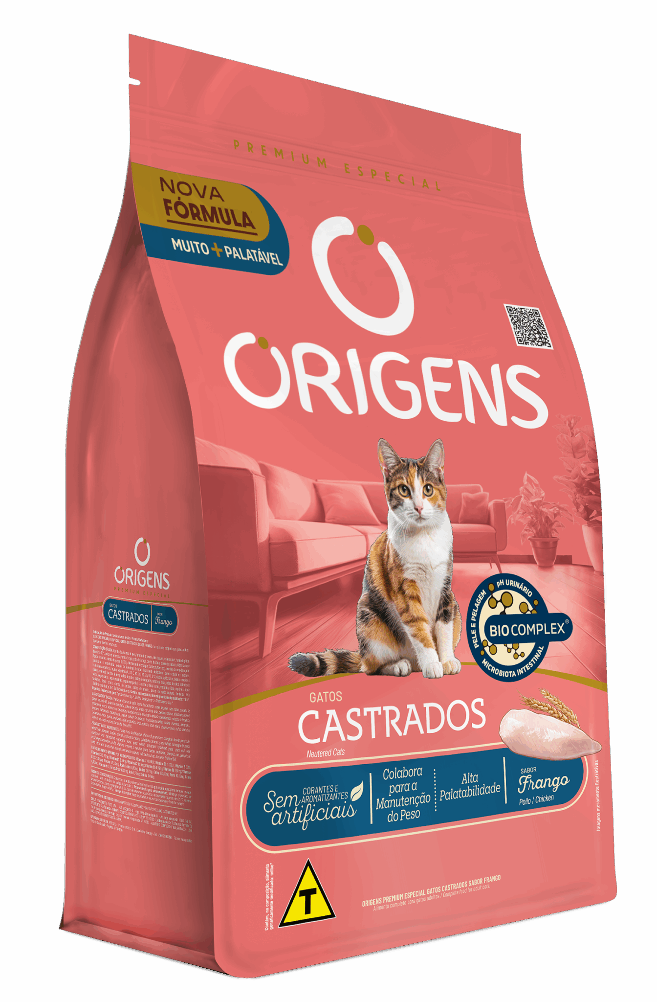 Origens é uma linha de alimentos Premium Especial que nutre o que há de melhor: o amor. Promover saúde e prazer a cada refeição é antes de tudo um ato de carinho, que estreita laços e prolonga os dias de alegria, amizade e amor incondicional entre tutores e seus cães e gatos. Origens Gatos Castrados Sabor Frango possui ingredientes de alta qualidade e não contém corantes e aromatizantes artificiais. Indicado para gatos castrados, sedentários, com tendência a engordar e para quem tem mais de um gato em casa.