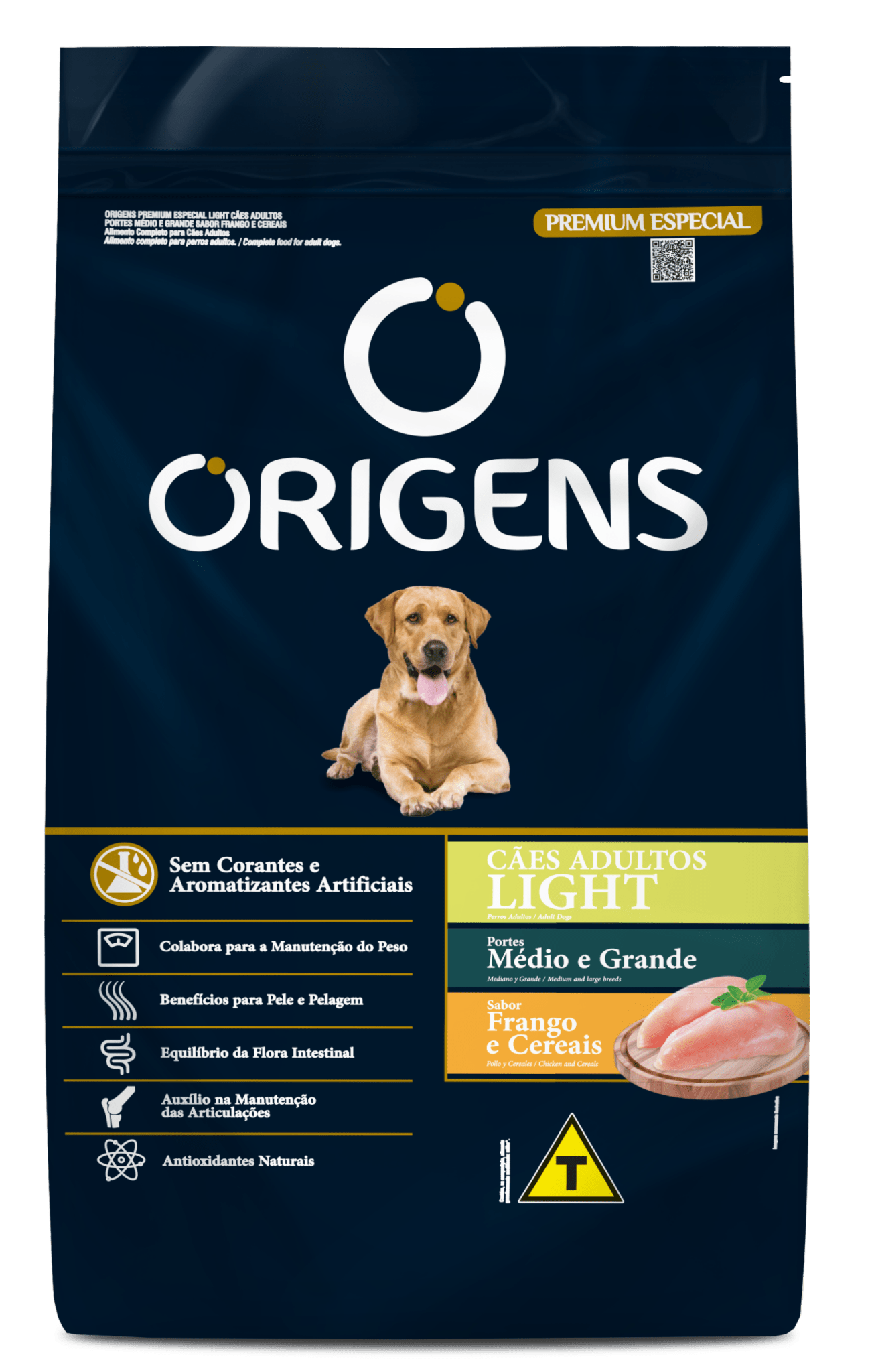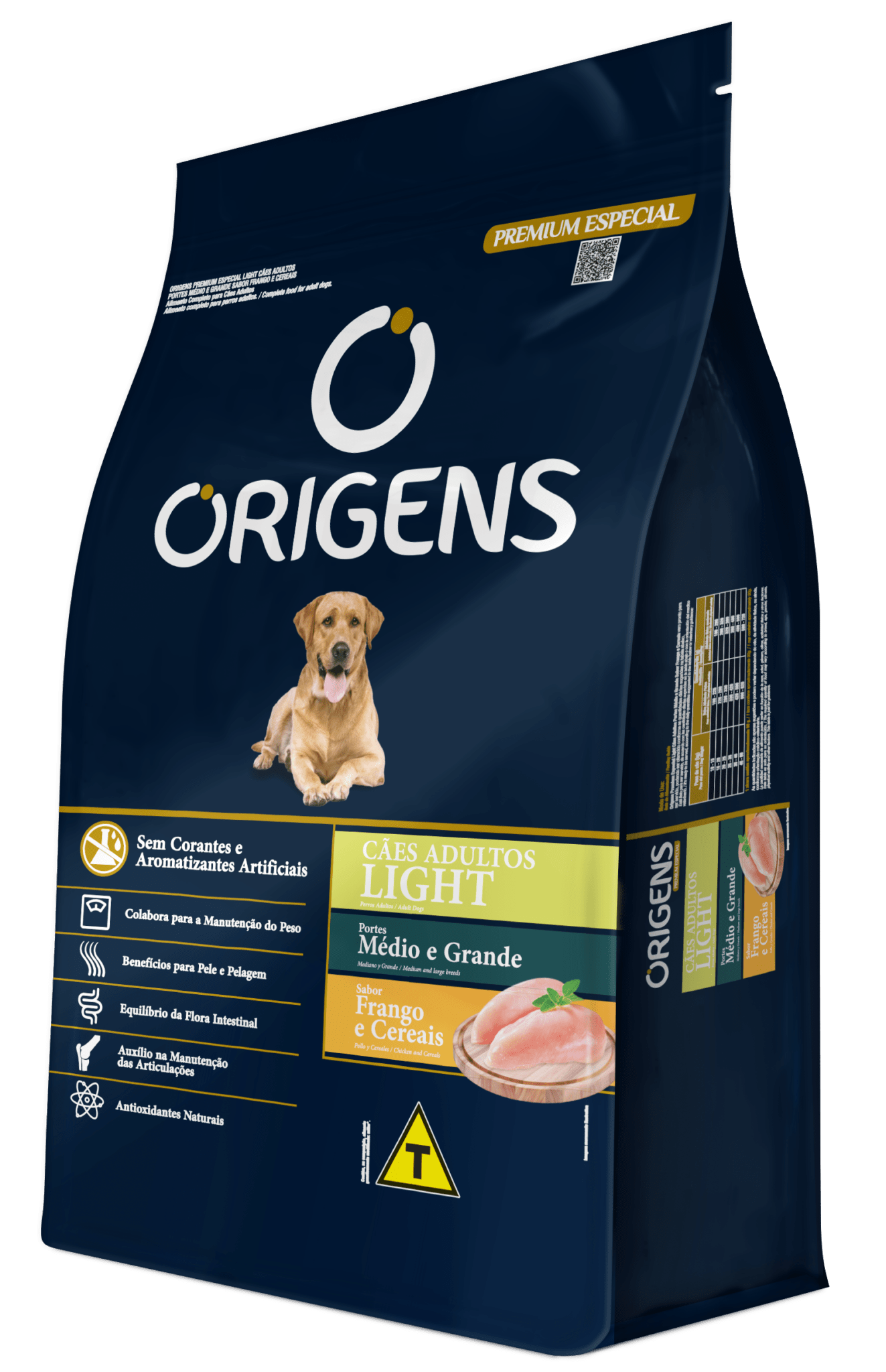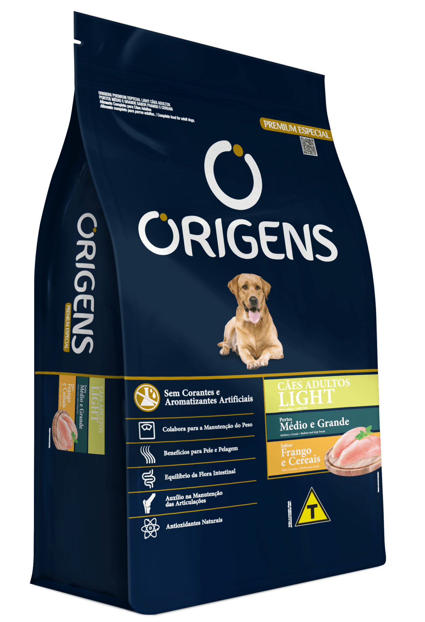 Origens Premium Especial Light Cães Adultos Portes Médio e Grande Sabor Frango e Cereais