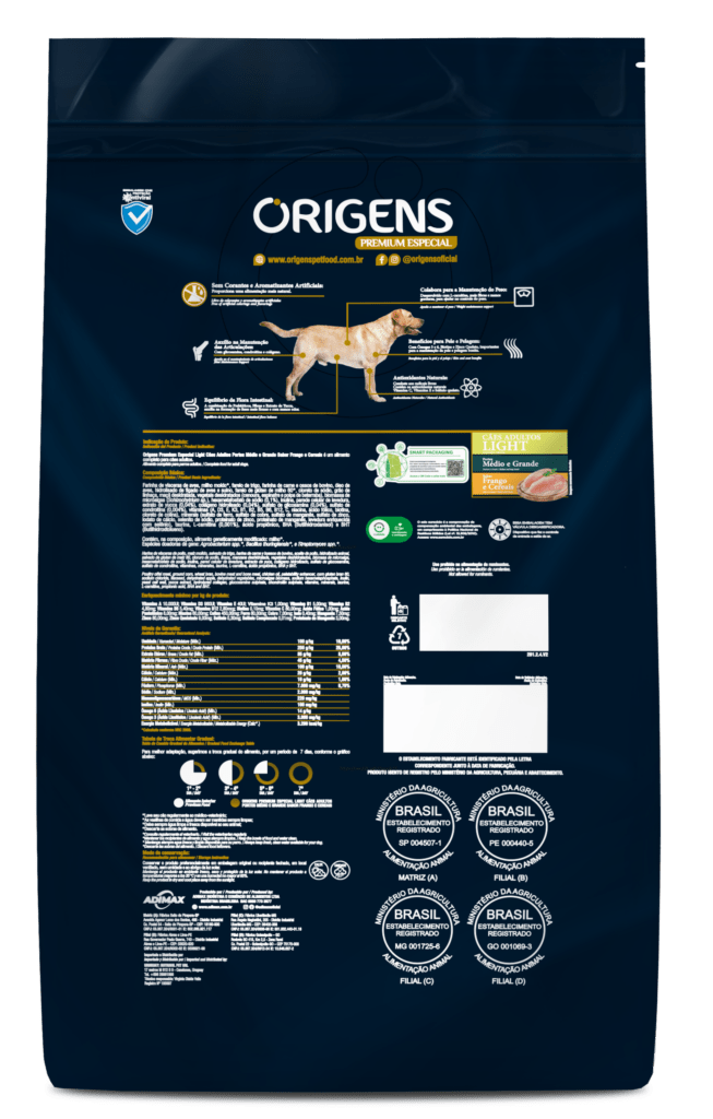 3 kg15 kgOrigens é uma linha de alimentos Premium Especial que nutre o que há de melhor: o amor. Promover saúde e prazer a cada refeição é antes de tudo um ato de carinho, que estreita laços e prolonga os dias de alegria, amizade e amor incondicional entre tutores e seus cães e gatos. Origens Premium Especial Light Cães Adultos Portes Médio e Grande Sabor Frango e Cereais possui ingredientes de alta qualidade e não contém corantes e aromatizantes artificiais.