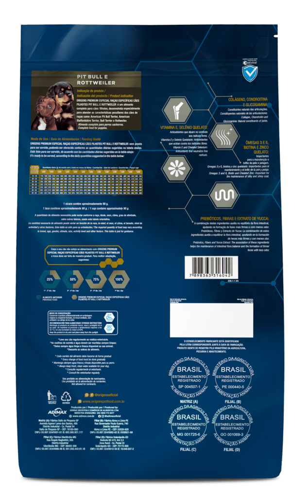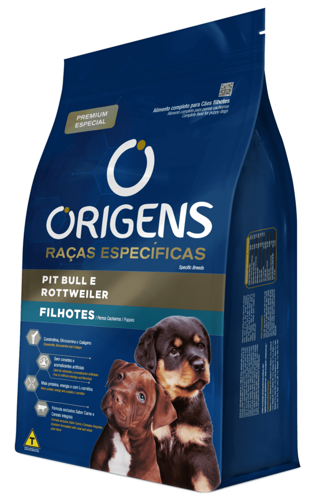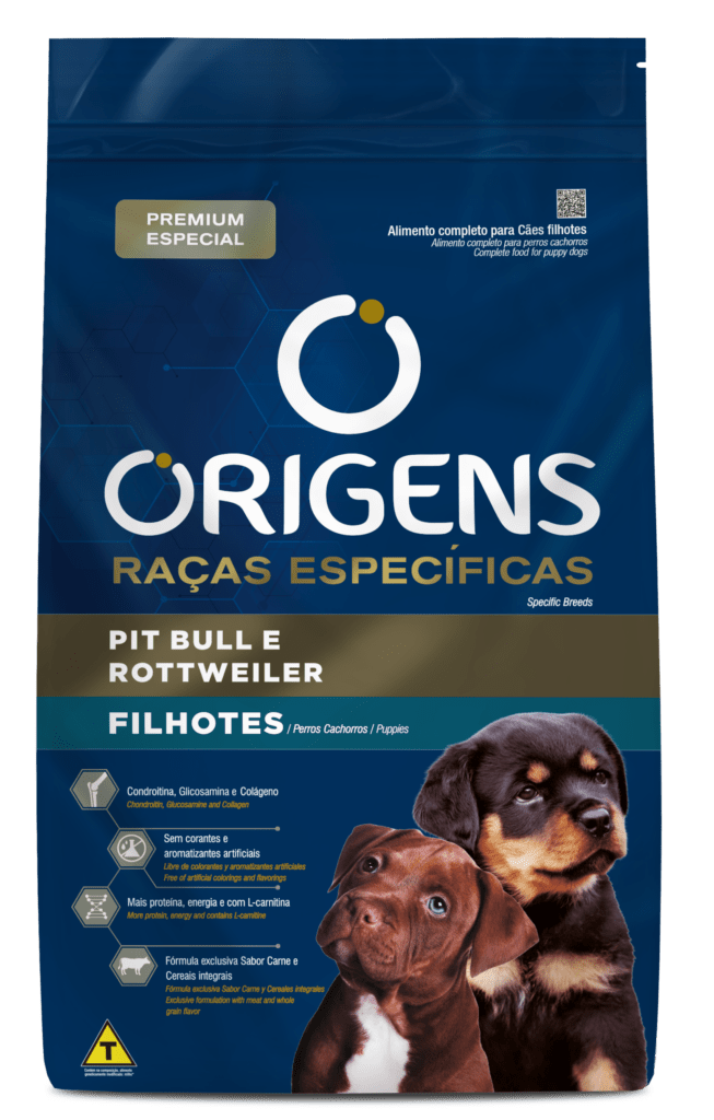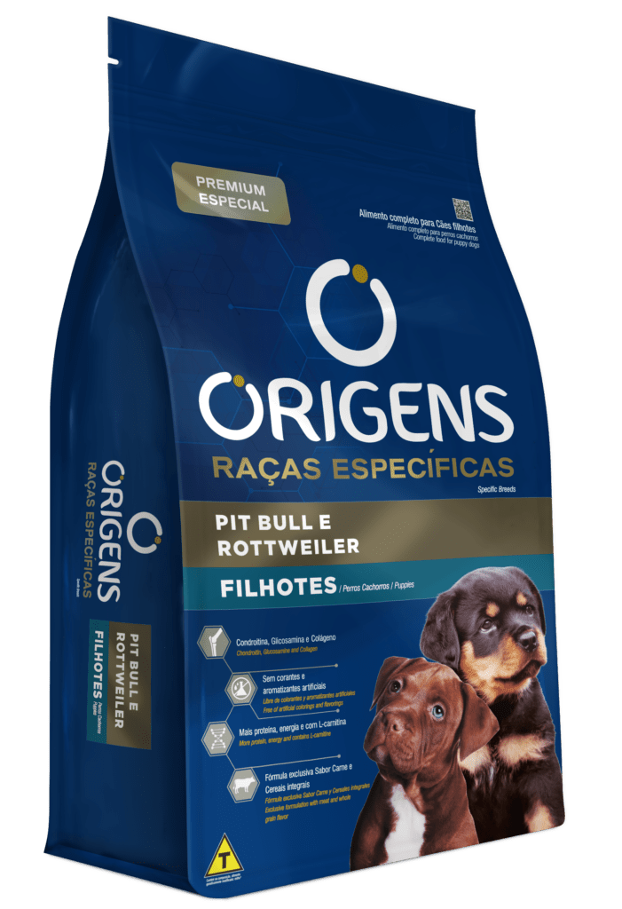Origens Raças Específicas é uma linha de alimentos Premium Especial para raças específicas. que nutre o que há de melhor: o amor. Promover saúde e prazer a cada refeição é antes de tudo um ato de carinho, que estreita laços e prolonga os dias de alegria, amizade e amor incondicional entre tutores e seus cães. Origens Raças Específicas Pit Bull e Rottweiler não contém corantes e aromatizantes artificiais e possui uma nutrição específica para cães filhotes das raças Pit Bull e Rottweiler.