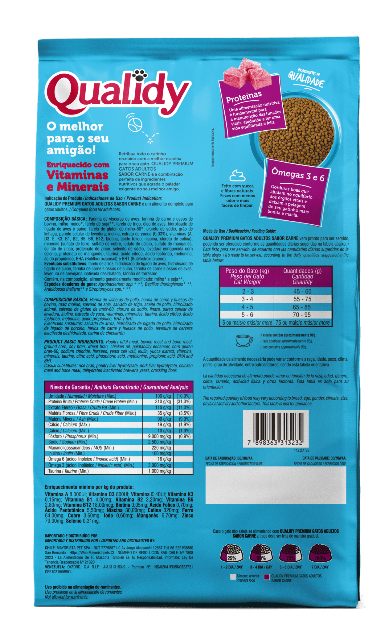 Farinha de vísceras de aves, farinha de carne e ossos de bovino, óleo de aves, milho moído*, farelo de soja**, farelo de trigo, farelo de glúten de milho 60*, grão de linhaça, cloreto de sódio, hidrolisado de fígado de suíno, parede celular de levedura, inulina, extrato de yucca (0,03%), taurina, vitaminas (A, D3, E, K3, B1, B2, B5, B6, B12, niacina, ácido fólico, biotina, cloreto de colina), minerais (sulfato de ferro, sulfato de cobre, sulfato de manganês, sulfato de zinco, iodato de cálcio, selenito de sódio, organozinco, organosselênio, organomanganês), metionina, ácido propiônico, ácido fosfórico, ácido cítrico, cloreto de amônio, sulfato de amônio, bentonita, BHA (Butilhidroxianisol) e BHT (Butilhidroxitolueno). Eventuais substitutivos: Farinha de carne e ossos de aves, farinha de vísceras com ossos, farinha de carne e ossos de suíno, farinha de torresmo, farelo de arroz, farelo de arroz desengordurado, quirera de arroz, grão de sorgo, extrato de leveduras, levedura hidrolisada desidratada, levedura de cervejaria inativada desidratada, hidrolisado de fígado de aves, hidrolisado de fígado de aves e suíno, aluminossilicato de cálcio e sódio. Contém, na composição, alimento geneticamente modificado: milho* e soja**.
